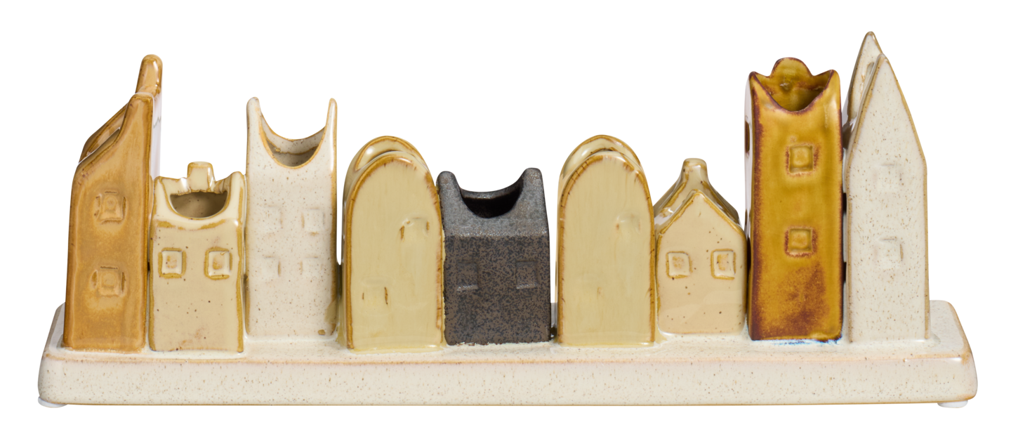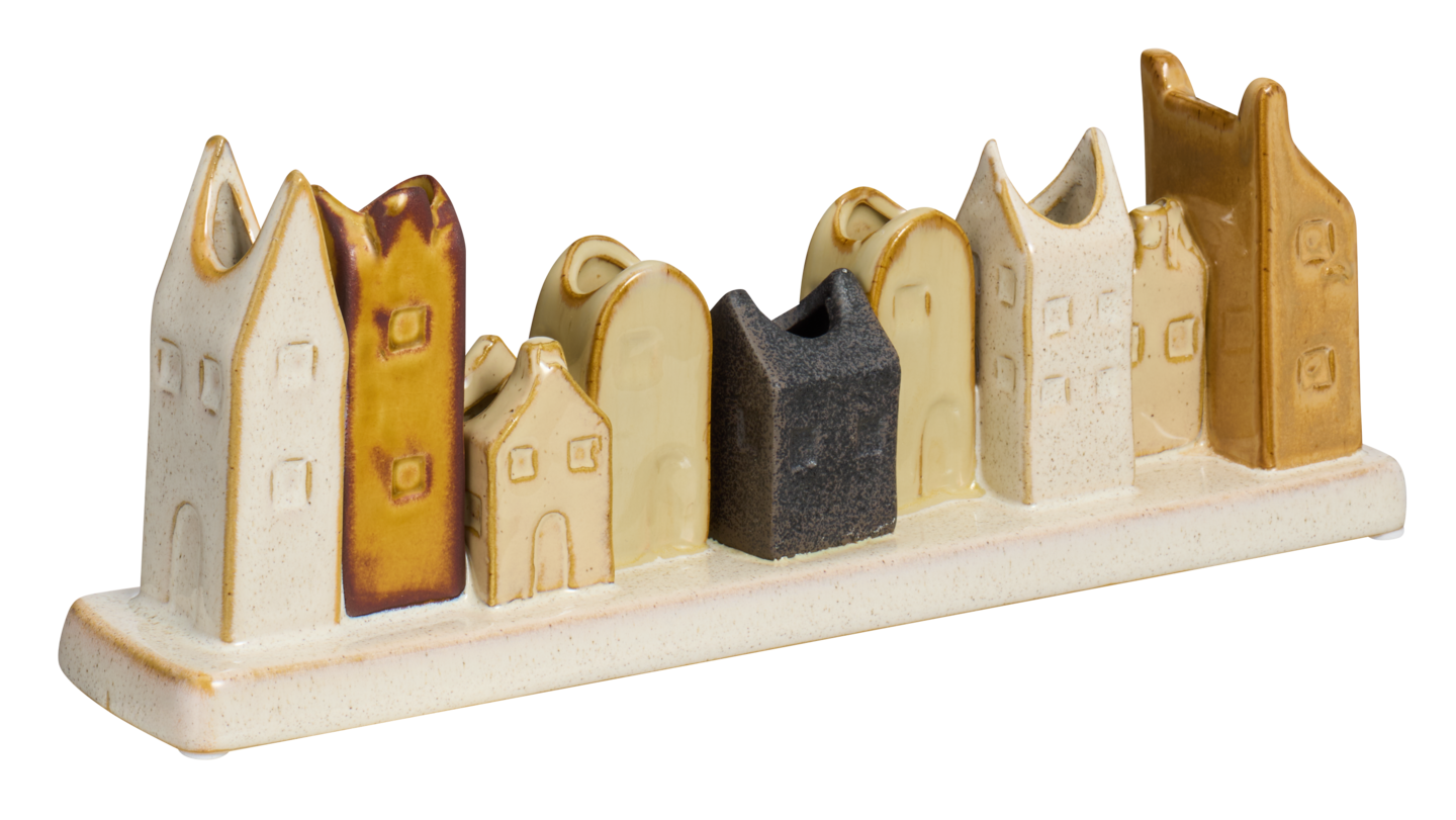 Keraaminen kynttilänjalka on viehättävä ja kekseliäs sisustuselementti. Kapeat, perinteiset kynttilät tai LED-kynttilät voi asetella osaan talon muotoisista pidikkeistä. Kynttilänjalka sopii erilaisiin asetelmiin ja vaikka ikkunalaudalle yksinään. Sitä voi käyttää myös koristeena ympäri vuoden. Kynttilänjalan korkeus on 11 cm, leveys 6,5 cm ja pituus 30 cm.