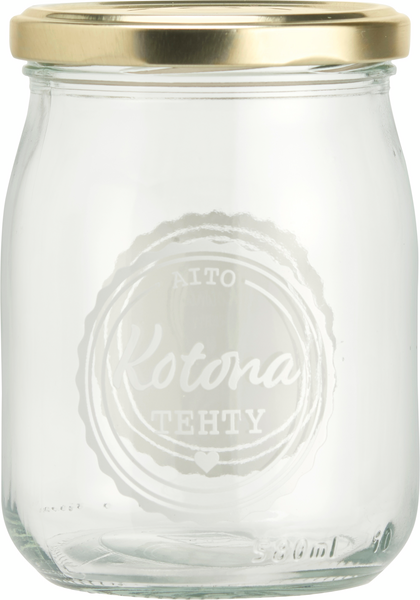 myhome-sarjasta löydät käytännölliset astiat niin arkeen kuin juhlaan. Ruuan säilytys on tärkeä osa ruoanvalmistusta ja ruokaturvallisuutta. myhome kierrekantinen säilöntätölkki 0,5 l "Kotona tehty". Soveltuu kotitekoisille hilloille, marmeladeille, hyytelöille. Kaunis myös irtomausteiden ja kuivattujen yrittien säilytyksessä. Konepesunkestävää lasia.