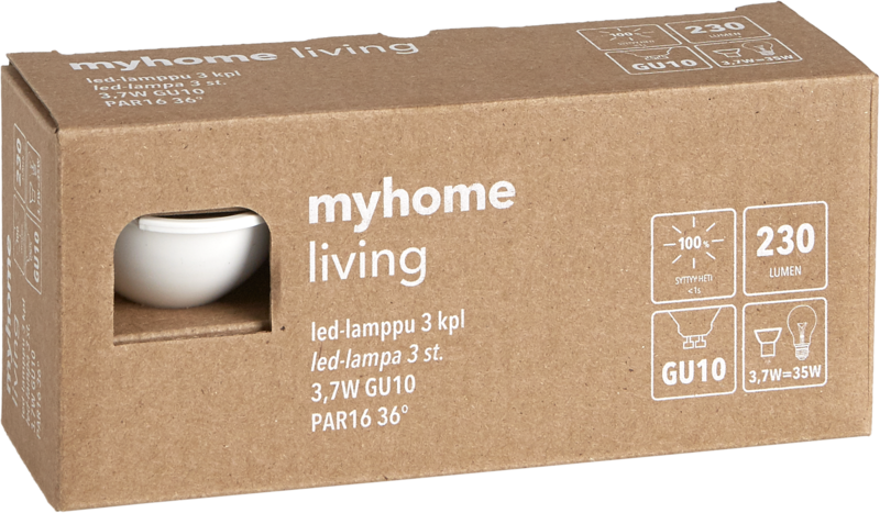 Opaalikupuinen led-kohdelamppu, 3 kpl paketissa. Valovirta kartiossa 90 astetta. Kanta GU10, 2-piikkinen. Teho 3,1W, vastaa 35W hehkulamppua. Lämmin valkoinen valo 2700K. Lampun käyttöikä keskimäärin 15 000h.