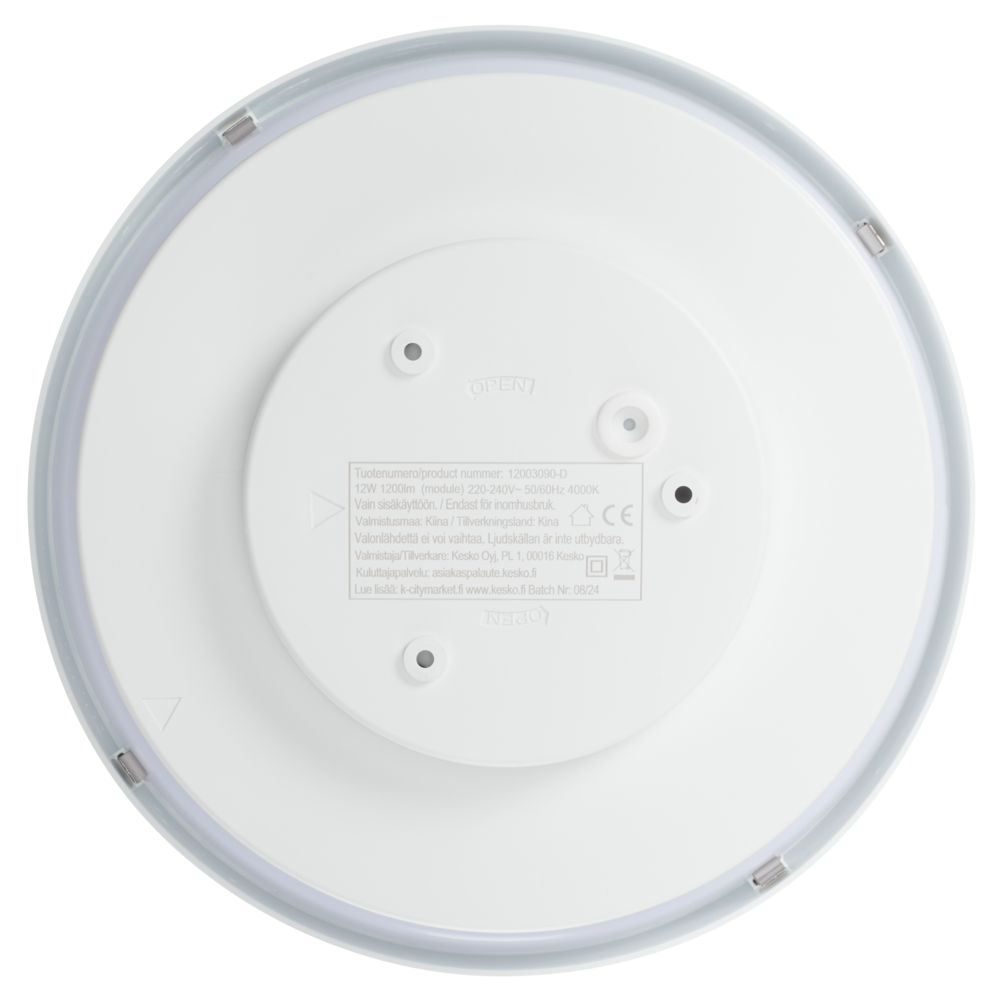 Valkoinen LED-plafondi sisäkäyttöön. Tuote sisältää valonlähteen, jonka energialuokka on F. Valonlähde ei ole vaihdettavissa.