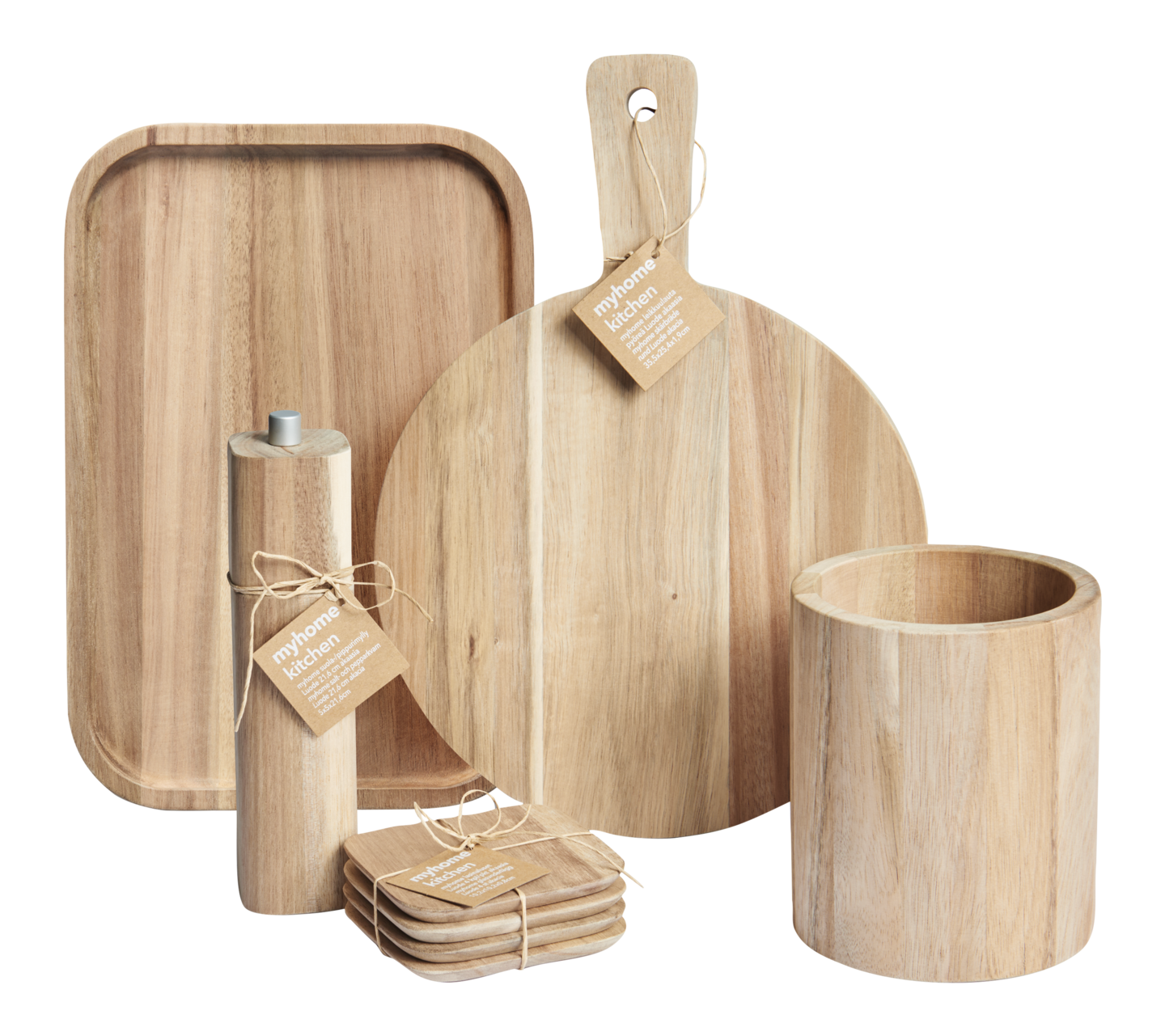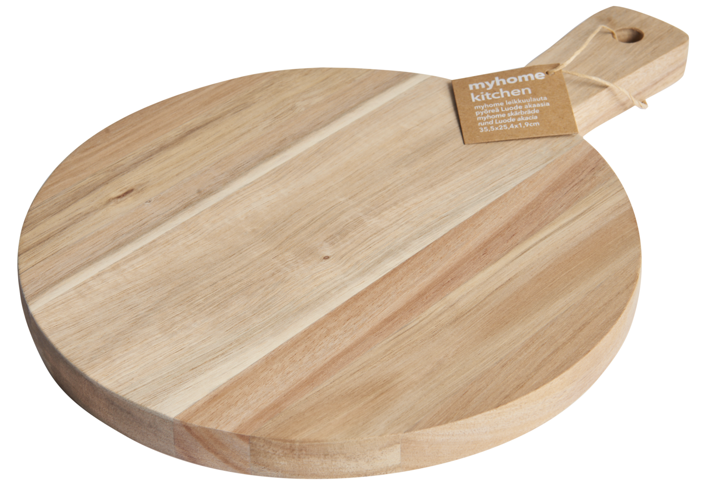 myhome-sarjasta löydät käytännölliset astiat niin arkeen kuin juhlaan. myhome Luode -sarjan monikäyttöinen akaasia puinen pyöreä leikkuu-, ja tarjoilulauta, jossa kätevä kahva kantamiseen ja tarjoiluun. Leikkuulautaa voidaan käyttää esimerkiksi juuston tai leikkeleiden tarjoiluastiana. Yhdistele muihin Luoto -sarjan akaasia puisiin tuotteisiin, saat lämminsävyisen ilmeen kattaukseen ja keittiöön. Pyöreän leikkuuosan läpimitta n. 25 cm. Akaasiapuu on lujaa ja kestävää puuta. Se kestää kovaa käyttöä ja iskuja ja soveltuu erinomaiseti keittiötarvikkeiden materiaaliksi. Riippumatta siitä, onko kyseessä leikkuulauta, paistinlasta, tai kulho, akaasiapuusta valmistetut keittiötarvikkeet pysyvät ehjinä ja toimintakuntoisina vuosia, kun muistat huoltaa niitä oikein. Akaasiapuu on luonnon materiaali, valitsemalla akaasiapuusta valmistetut tarvikkeet teet ekologisen valinnan, vähentäen tarvetta muoveille ja keinotekoisille materiaaleille. Hoito-ohje: 1. Pyyhi lämpimällä vedellä kostutetulla liinalla ennen ensimmäistä käyttökertaa.