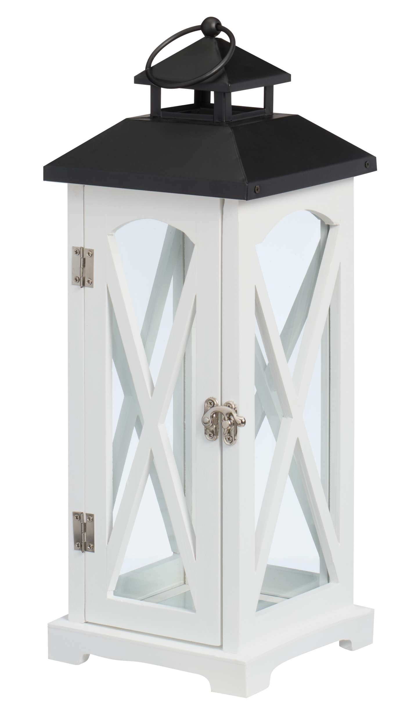 Valkoinen puulyhty mustalla metallikatolla tuo kodikasta tunnelmaa kotiin ja puutarhaan. Lyhdyssä on kaunis ja ajaton design. Lyhdyssä on valkoiset puuristikot ikkunoissa. Lyhty aukeaa yhdeltä sivulta ja suljetaan hakasella, joten kynttilä on helppo sammuttaa, sytyttää ja vaihtaa. Lyhdyn korkeus on 40 cm ja leveys 15 cm.