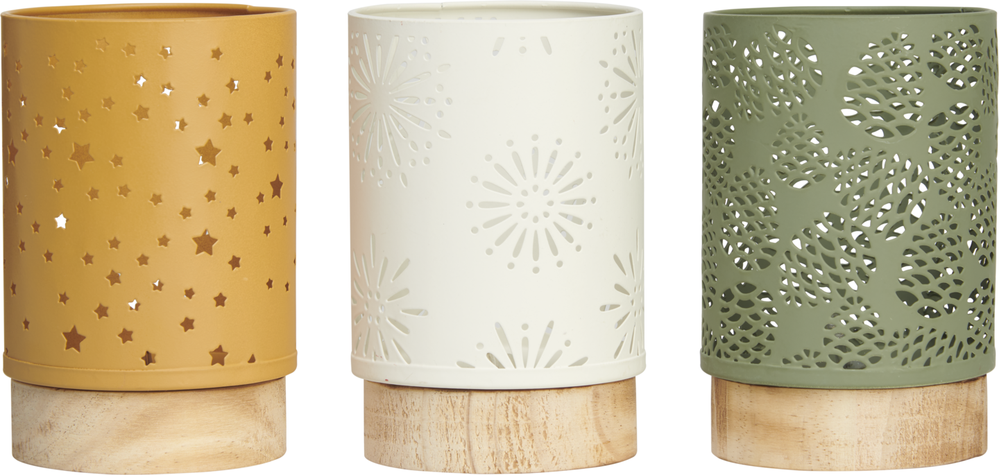 Metallinen kauniisti reikäkuvioitu lyhty lämpökynttilälle tai led-kynttilälle. Pohja puuta. Lyhtyjä on kolmea eri väriä: keltainen, valkoinen ja vihreä. Halkaisija 9 cm, korkeus 13,5 cm.
