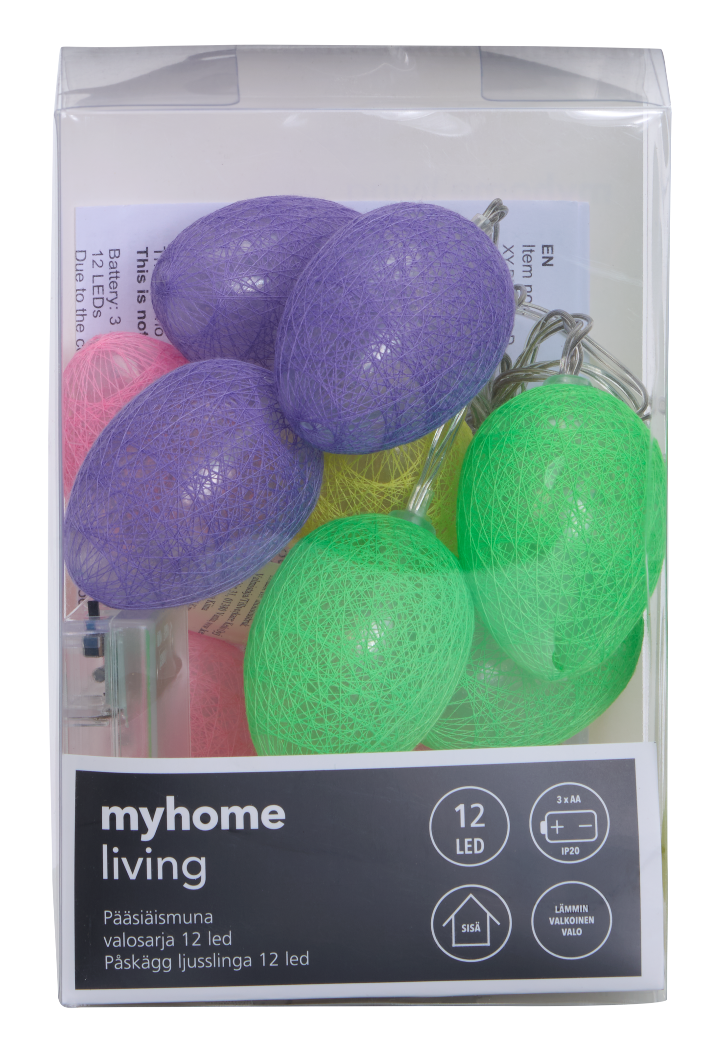 Pääsiäisvalosarja, joka tuo juhlaan ja sisustukseen iloista, keväistä tunnelmaa. Valosarjassa on 12 LED-valoa, jotka on sijoitettu värikkäisiin (keltainen, violetti, pinkki ja vihreä) pääsiäismunakoristeisiin. Jokainen muna on kooltaan noin 4 x 6 cm ja niiden väli on 15 cm. Valosarjassa on kolme toimintoa sisältävä kytkin: ON, OFF sekä TIMER eli ajastintoiminto, joka pitää valot päällä 6 tuntia ja sammuttaa ne automaattisesti 18 tunniksi. Tuote on IP20-luokiteltu sisäkäyttöön ja toimii kolmella AA-paristolla (ei sisälly pakkaukseen). Johto on läpinäkyvä, liitosjohdon pituus 0,5 m.