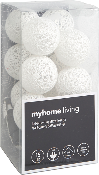 15 lampun LED- puuvillapallovalosarja, pallot Ø 8 cm. Lämmin valkoinen LED. Lamppujen väli: 20 cm. Lamput ei vaihdettavissa. Valosarjan pituus: 2,80 m. Liitäntäjohdon pituus: 3 m. FI-hyväksytty muuntaja, IP44. Ainoastaan sisäkäyttöön.