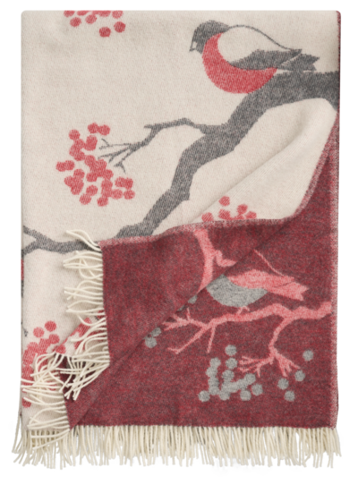 Kaunis ja lämmin villahuopa, jossa punatulkku-aiheinen kuviointi. Kuvio toistuu myös huovan kääntöpuolella, mutta värit päinvastaisina. Koko 130 x 170 cm, hapsureunat päädyissä viimeistelevät ilmeen.
