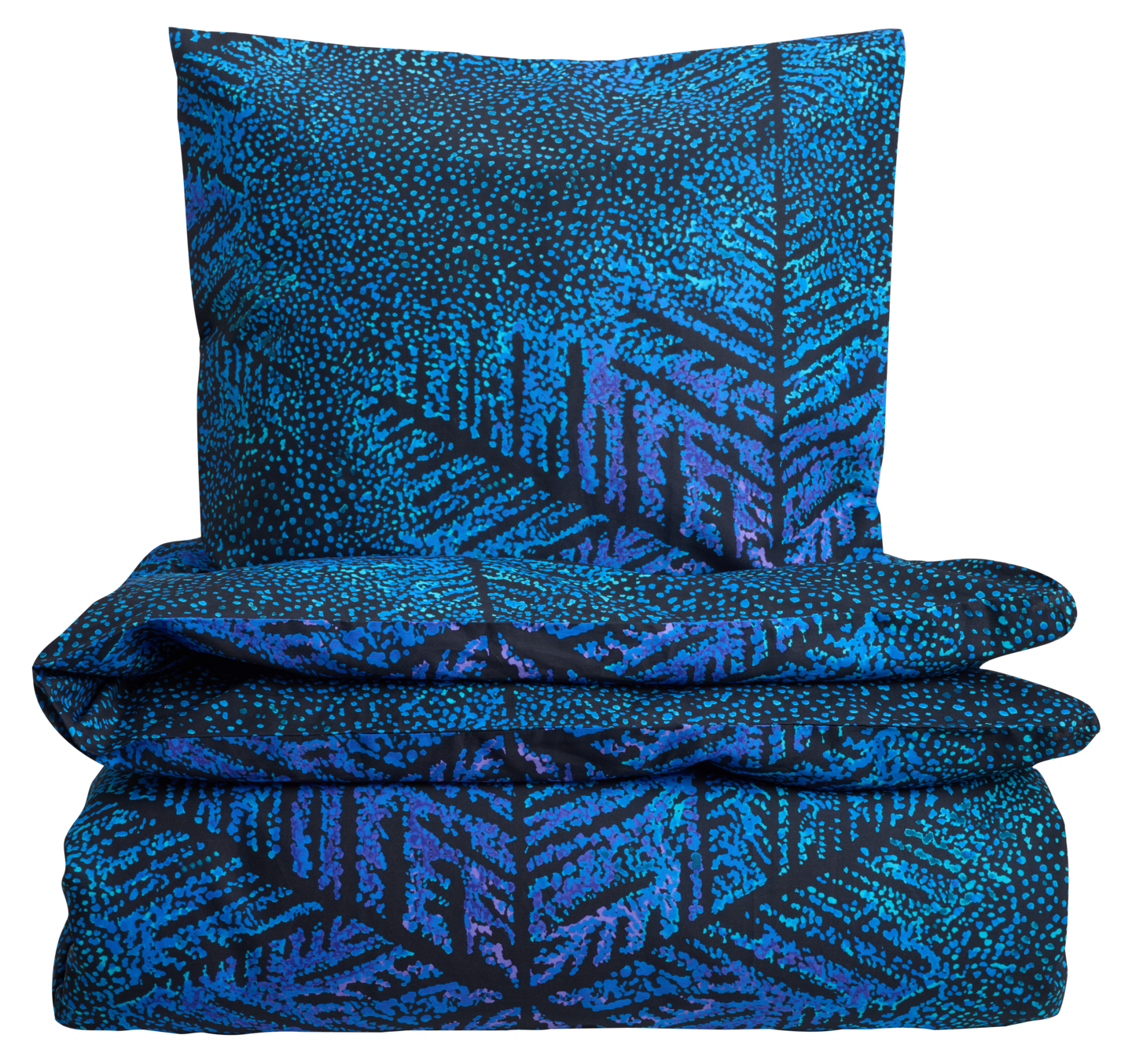 Rauhallinen sinisävyinen Lumitähti-kuosi. Pakkauksessa pussilakana 150 x 210 cm ja tyynyliina 55 x 60 cm. 100 % puuvillaa. Pesu 60 asteessa. Pussilakanan yläosassa käsiaukot sekä alareunassa nappisuljenta. Lankatiheys 144.