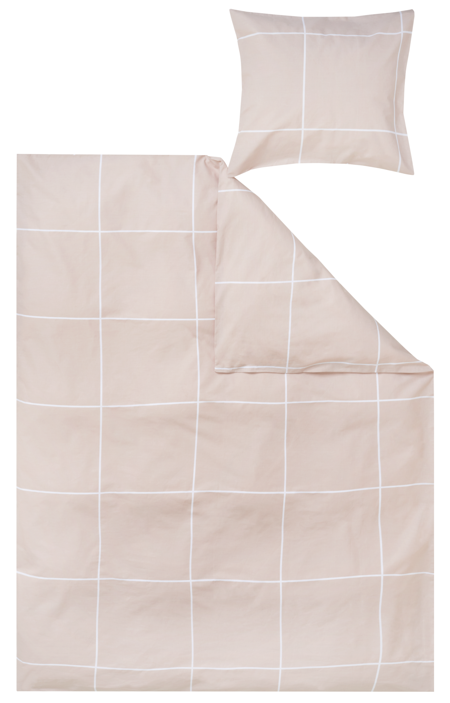 Hiekan värisessä pussilakanasetissä on hillitty suurikokoinen ruudutus. Pakkauksessa pussilakana 150 x 210 cm ja tyynyliina 55 x 60 cm. 100 % puuvillaa. Pesu 60 asteessa. Pussilakanan yläosassa käsiaukot sekä alareunassa nappisuljenta. Lankatiheys 144.