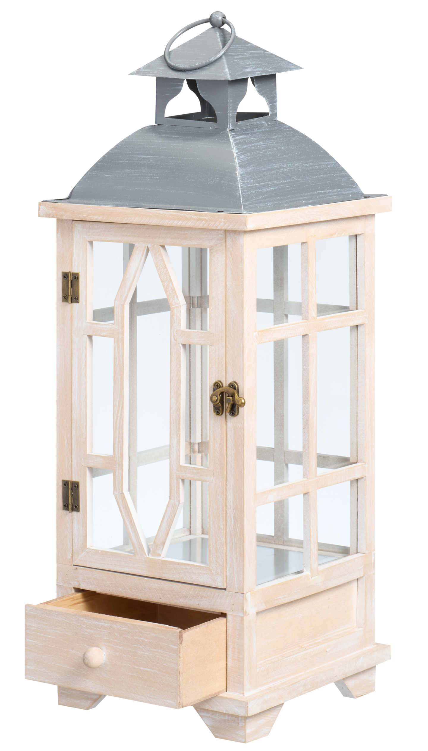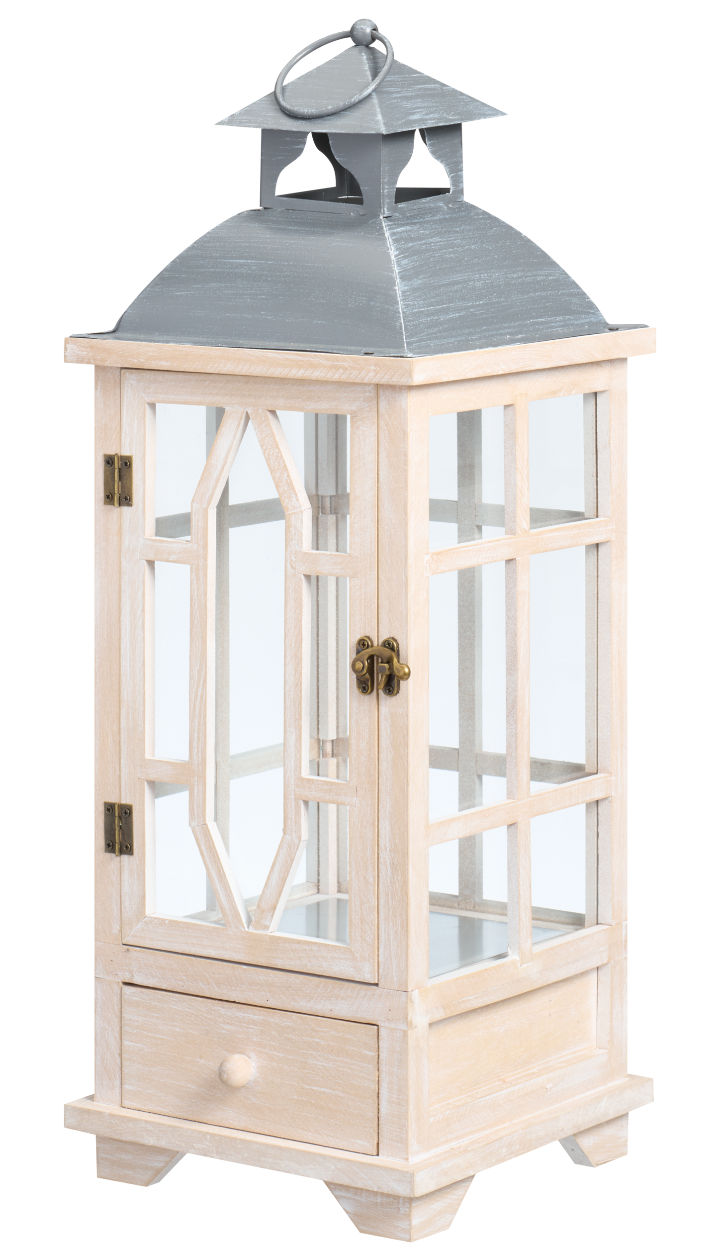 Suurikokoinen puulyhty luo kutsuvan ja lämpimän tunnelman. Vaaleat puuosat ja harmaa metallikatto ovat käsitelty kauniisti kulutetun näköisiksi. Lyhdyn ikkunoissa on puuristikot. Lyhty aukeaa yhdeltä sivulta ja suljetaan messingin värisellä hakasella, joten kynttilä on helppo sammuttaa, sytyttää ja vaihtaa. Lyhdyssä on myös tukeva kantokahva, josta sitä on helppo siirrellä, kun siinä ei ole palavaa kynttilää sisällä. Lyhdyn alla on pieni puinen avattava laatikko, jossa voi säilyttää pieniä tavaroita. Lyhdyn korkeus on 54,5 cm cm ja leveys 21 cm.