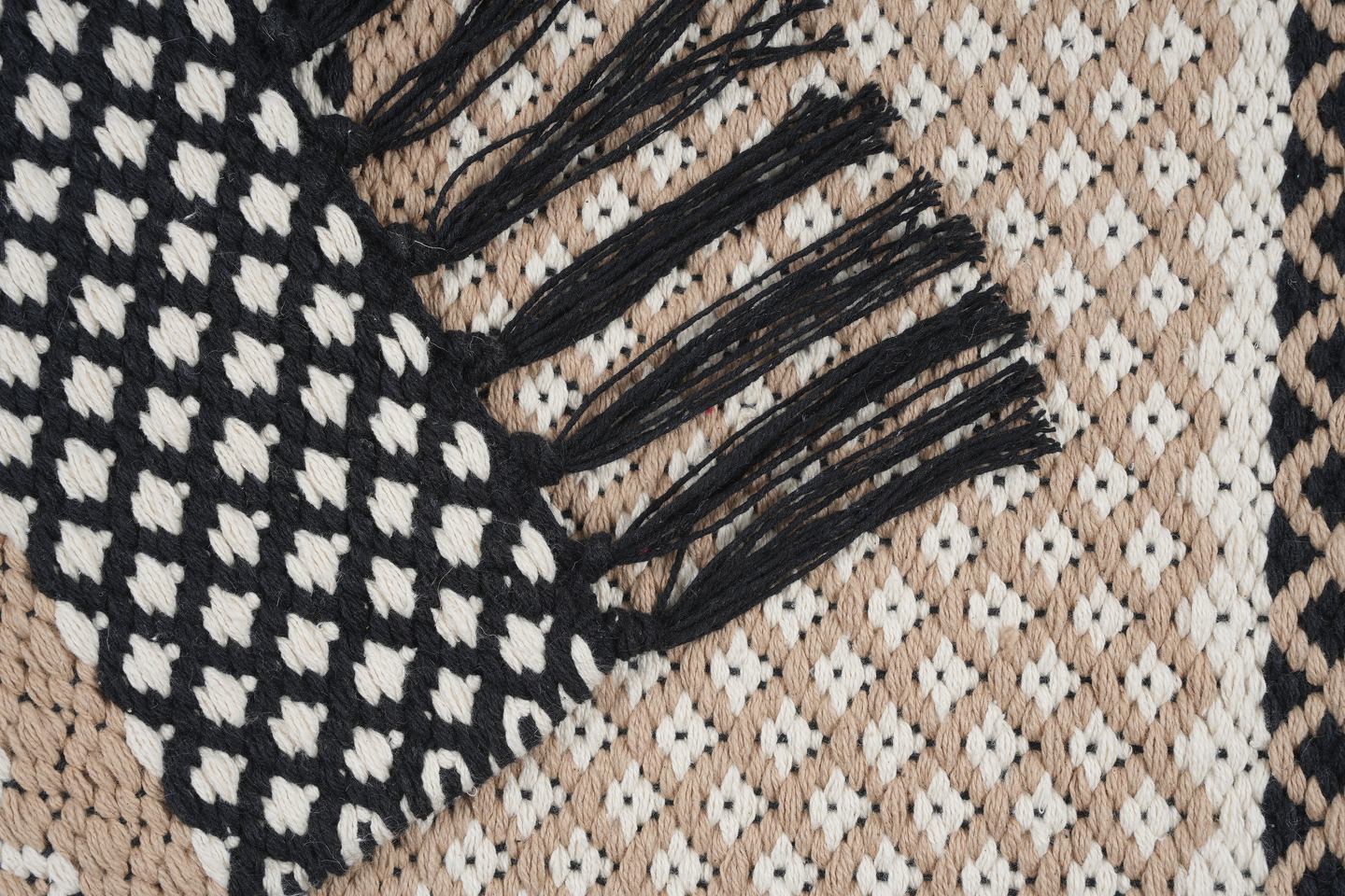 Käsinkudottu beige - musta raidallinen puuvillamatto tuo lämpöä jokaiseen kotiin. Sen kauniilla raidoituksella muokkaat helposti tilan ilmettä. Voit asettaa maton eteiseen, makuuhuoneeseen ja vaikka katetulle terassille tuomaan lisää persoonallisuutta.