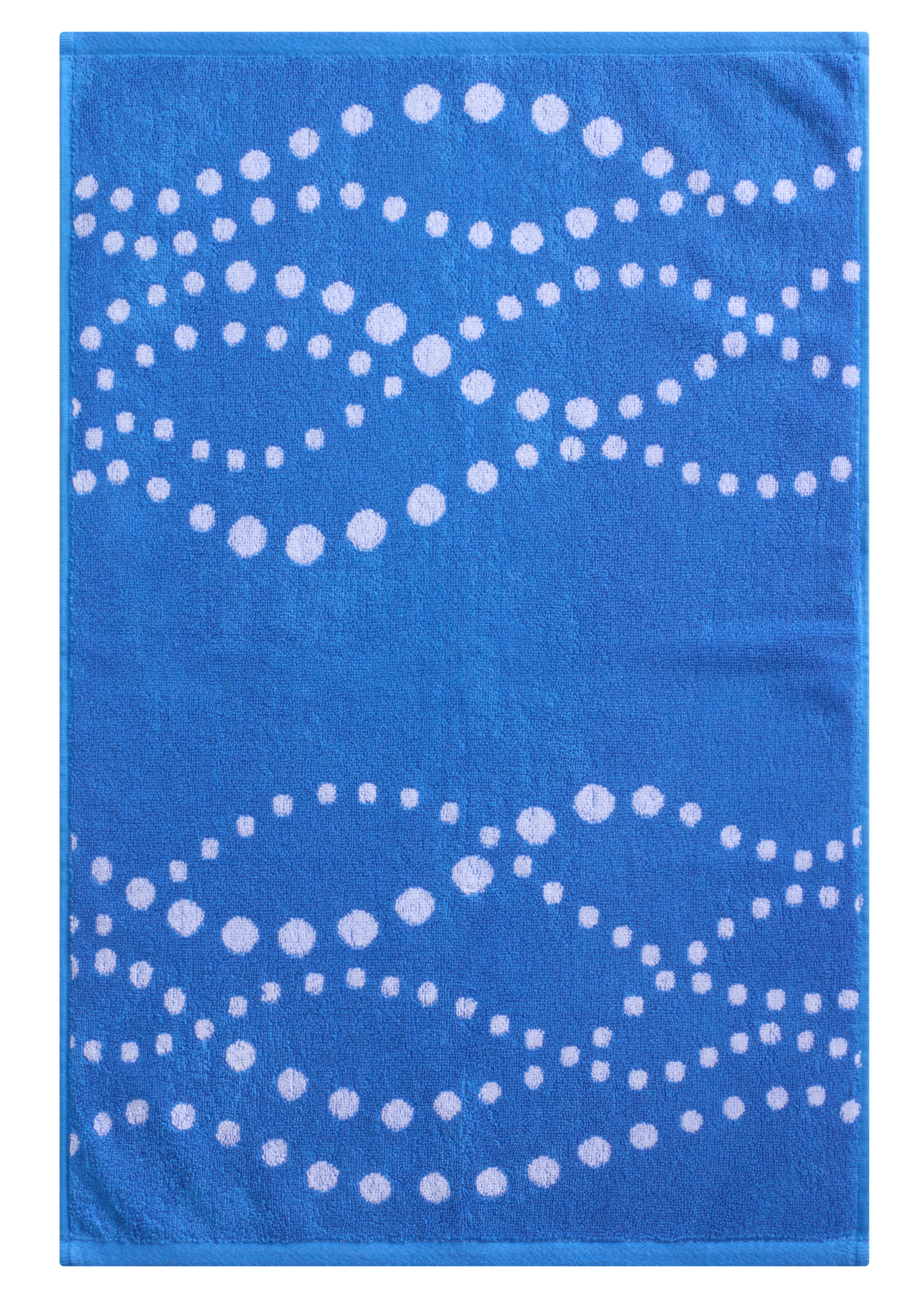 Lankavärjätyn pyyhkeen kuosissa on kuvattu laineen liplatusta hempeässä kesätuulessa. Käsipyyhe 100% puuvillafroteeta. Paino 500 g / m2. Pesu 60 asteessa.
