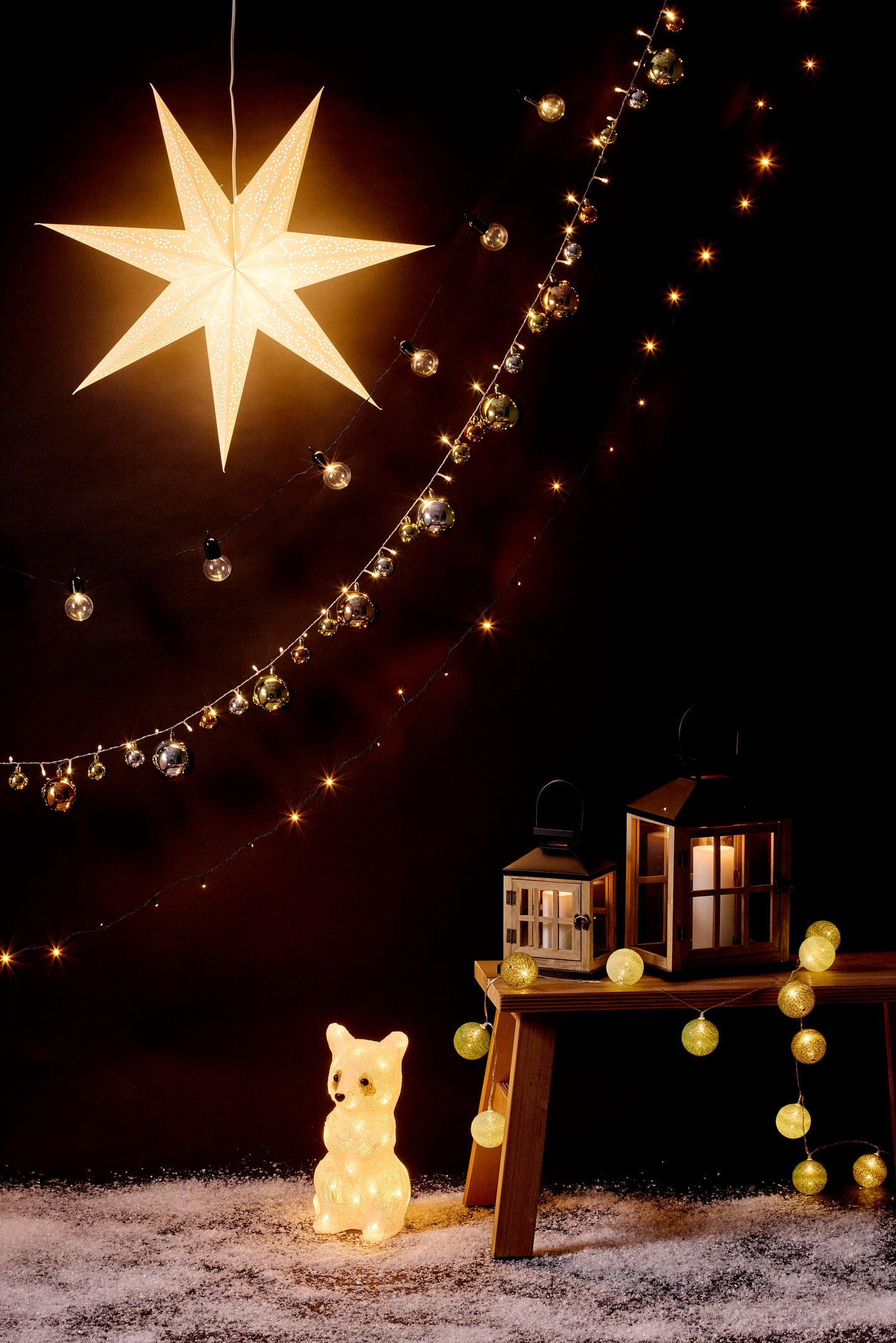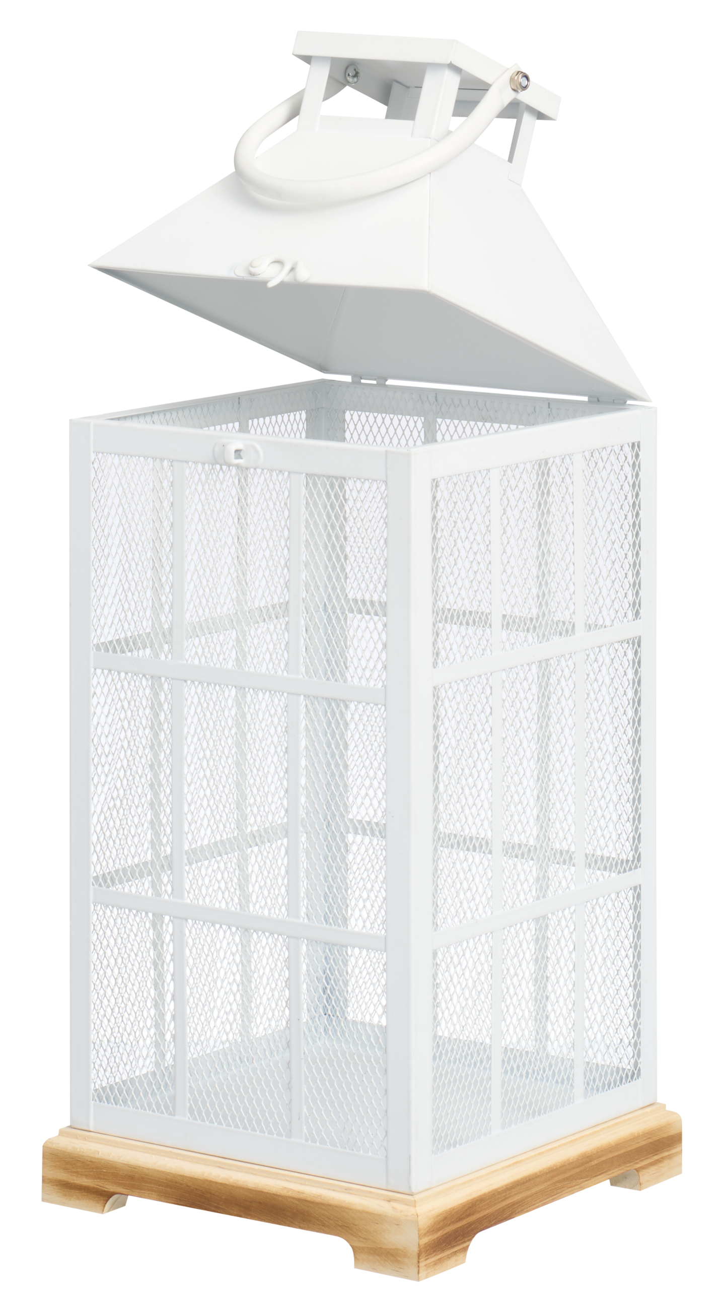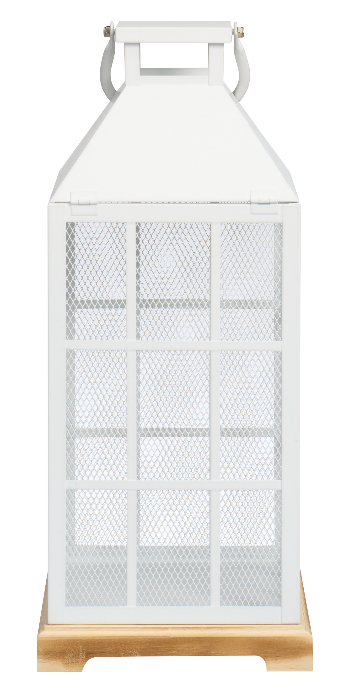 Valkoinen metallilyhty luo tunnelmallista valoa iltoihin ja juhliin. Lyhdyn seinät ovat tiheää ristikkoa metallilangasta, joka luo kiehtovia valon ja varjon leikkiä kynttilän palaessa. Lyhdyssä on lisänä tukeva puupohja ja se on tyylikäs sisustuselementti. Lyhdyn kansi aukeaa ja mahdollistaa perinteisen kynttilän, LED-kynttilän tai valosarjan asettamisen vaivattomasti.
