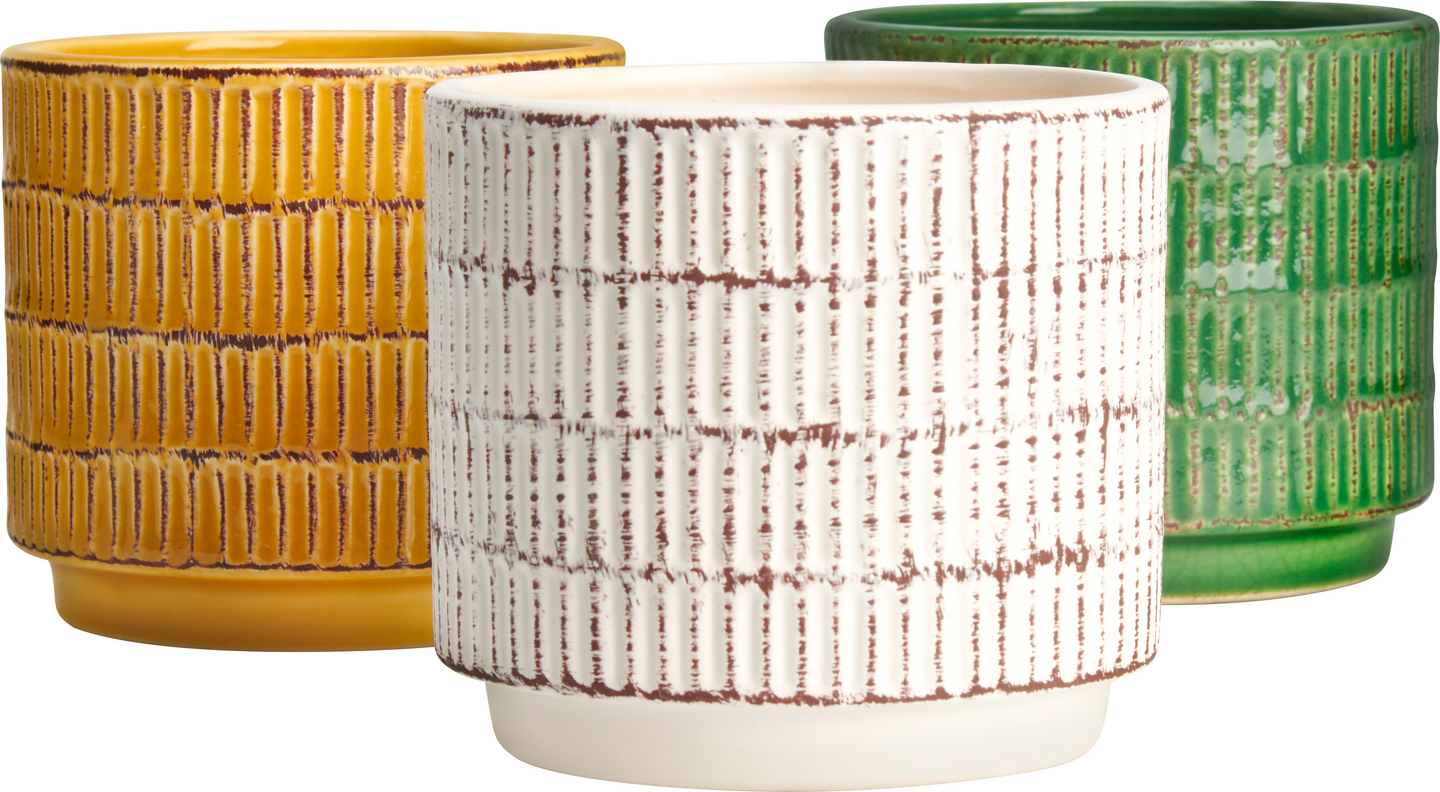 Keraaminen ruukku, jossa on kohokuvioitu pinta. Lajitelmassa on 3 väriä, keltainen, vihreä ja valkoinen. Ruukun halkaisija 11 cm ja korkeus noin 10 cm. Huom! Valitettavasti väriä ei voi valita verkkokaupasta tilattaessa, mutta lisätietoihin voi tilausvaiheessa lisätä toiveen, jonka toteutamme varastotilanteen mukaan. Pakkaus sisältää yhden tuotteen.