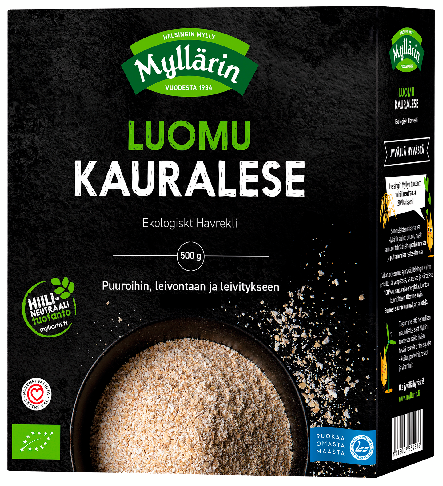Myllärin Luomu Kauralese sopii käytettäväksi lempeän pehmeän puuron valmistamiseen tai nopeaksi kuitulisäksi smoothieen tai jogurtin joukkoon. Kokeile myös vispipuuroon, sämpylätaikinaan, kala- tai kanafileiden leivitykseen ja kakkuvuoan jauhottamiseen. Tuote sisältää runsaasti kuitua ja proteiinia. Tuotteella on Hyvää Suomesta Joutsenlippu-alkuperämerkki sekä Sydänmerkki. Pakkauksen voi kierrättää keräyskartonkina.