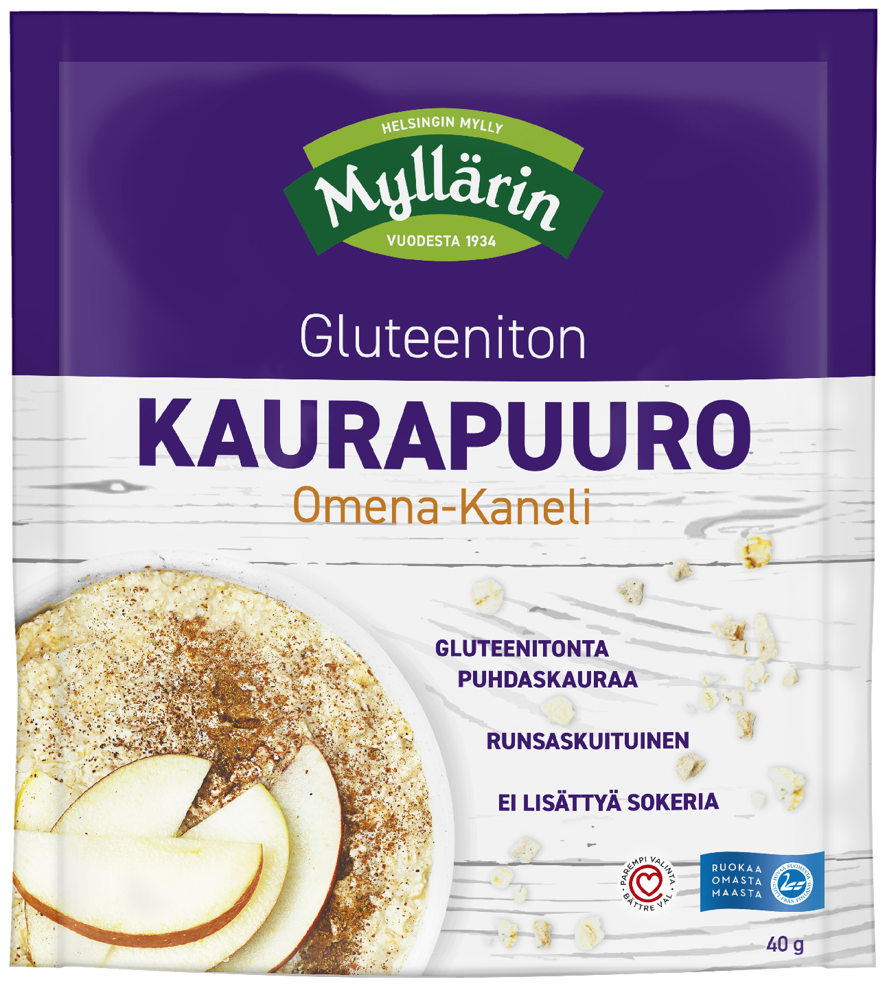 Myllärin Gluteeniton kaurapuuroannos on valmistettu kotimaisesta gluteenittomasti viljellystä kaurasta. Puuro valmistuu helposti kuumaan veteen suoraan lautaselle. Kätevä annospussi on helppo ottaa mukaan evääksi tai aamupalaksi minne tahansa. Runsaskuituinen puuro ei sisällä lisättyä sokeria. Tuotteella Hyvää Suomesta Joutsenlippu-alkuperämerkki sekä Sydänmerkki. Pakkauksen voi kierrättää keräyskartonkina.