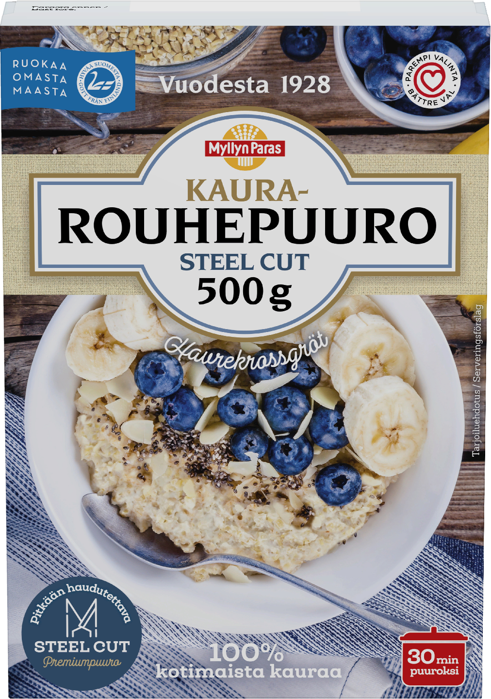 Myllyn Paras Kaurarouhepuuro Steel Cut eli leikattu kaura saadaan aikaan leikkaamalla kokonainen kauranjyvä rouheeksi. Rouhesein rakenteensa ansiosta valmiissa puurossa on enemmän purutuntumaa kuin perinteisessä kaurahiutalepuurossa.