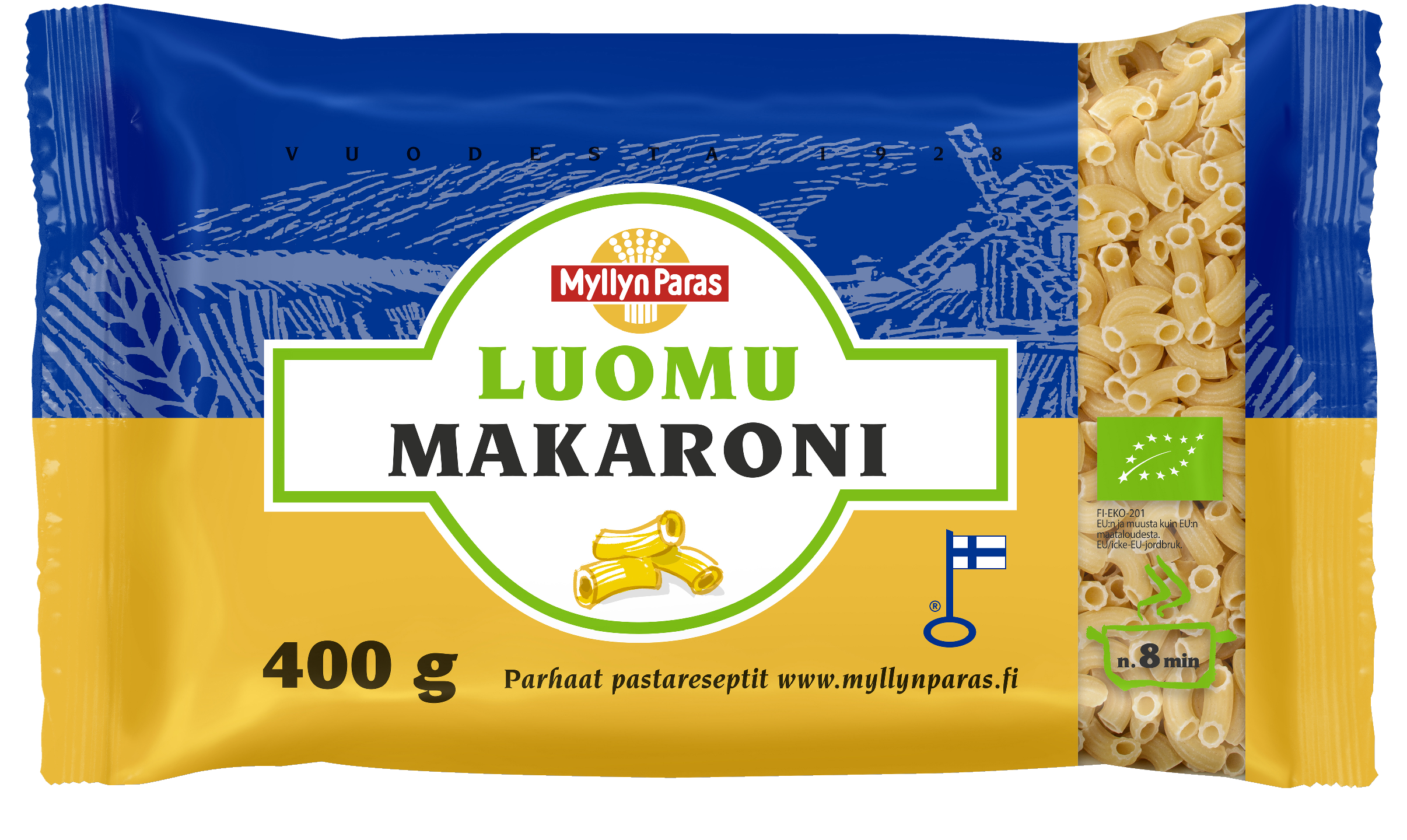 Myllyn Paras Luomu Makaroni, sarvimakaroni, valmistetaan 100 % luomuvehnäjauhosta ja vedestä.