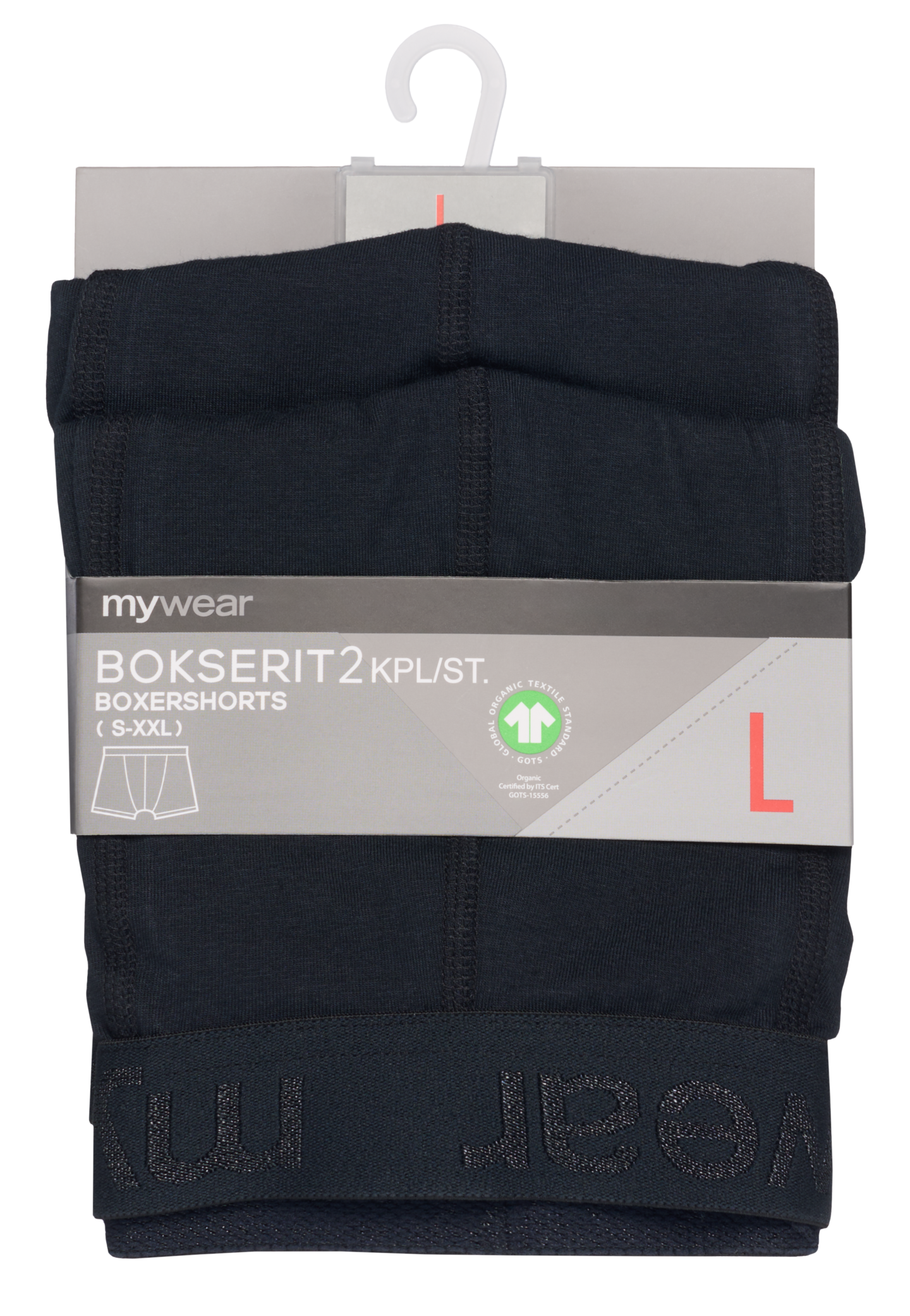 mywear miesten bokserit 2 kpl/pkt, molemmat mustia. Aukoton malli. Mukavan tuntuisessa housun värisessä vyötärökuminauhassa kudottuna sävy sävyyn mywear logo. Materiaali joustavaa puuvilla-elastaania. Tuote on GOTS-sertifioitu. GOTS (Global Organic Textile Standard) on kansainvälinen merkki luomupuuvillalle. Vähintään 70 prosenttia kuiduista on kasvatettava luonnonmukaisesti. Standardi määrittelee korkeat ympäristökriteerit luomutekstiilien koko toimitusketjussa ja edellyttää myös sosiaalisten kriteerien noudattamista. Lue lisää GOTS:stä täältä: global-standard.org.Saatavana myös punainen/tummansininen.