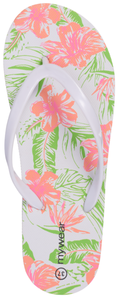 Mywear Ariel naisten varvassandaalit. Sisäpohjallisessa kaunis kukkaprintti. Kevyt jalkaan sujautettava malli. Ulkopohja eva-materiaalia.
