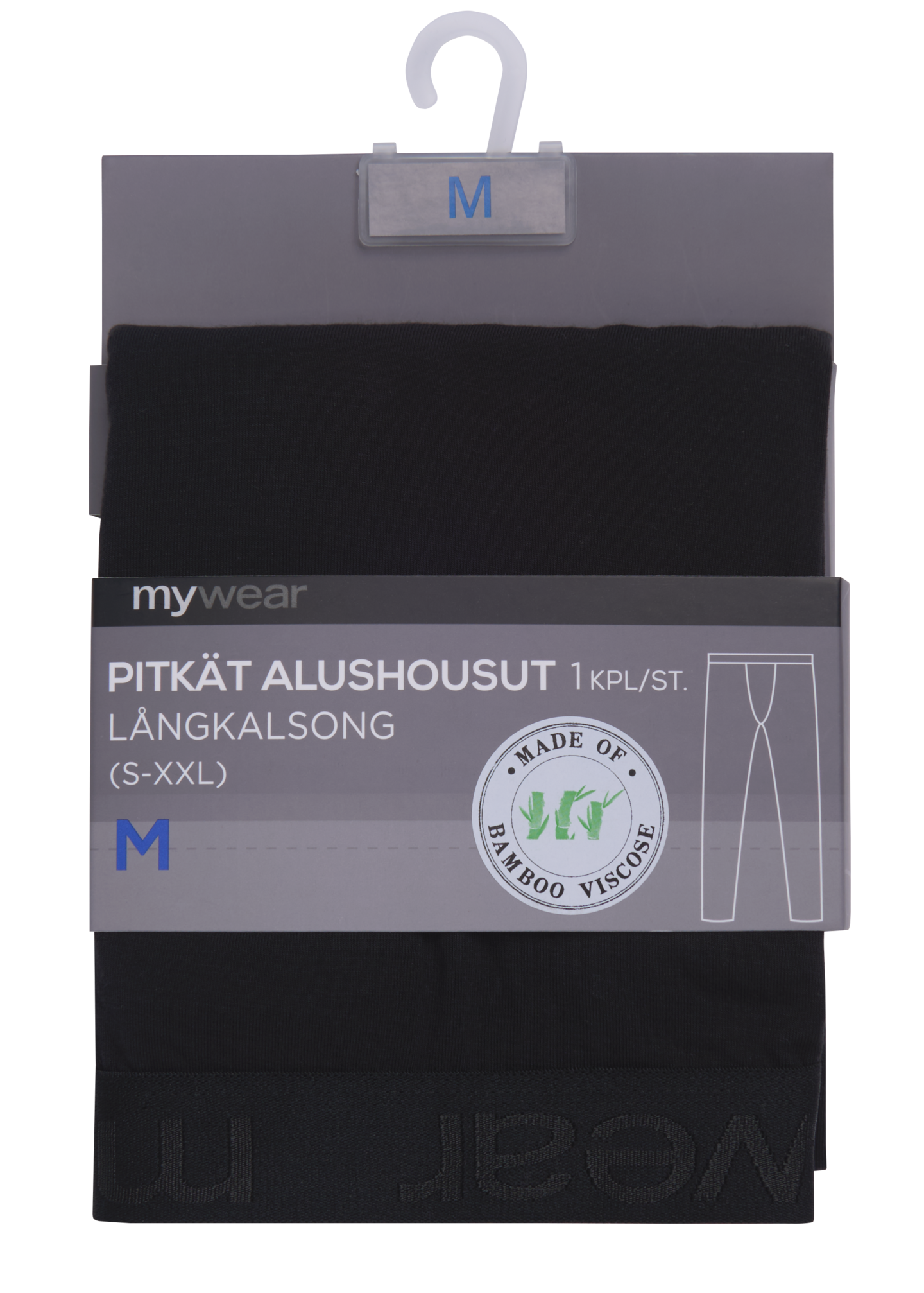 Miesten aukottomat pitkät alushousut. Väri musta. Vyötäröllä pehmeä, 3,5cm leveä kuminauha, jossa samanvärinen mywear-logo. Materiaali on miellyttävää bambuviskoosi-elastaania.