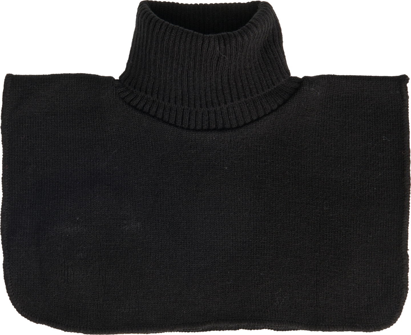 Musta kauluri. Miehustan osuus sileää neulosta ja kaulan osuus ylhäältä taitettu ribbineulos. 100% Polyester.