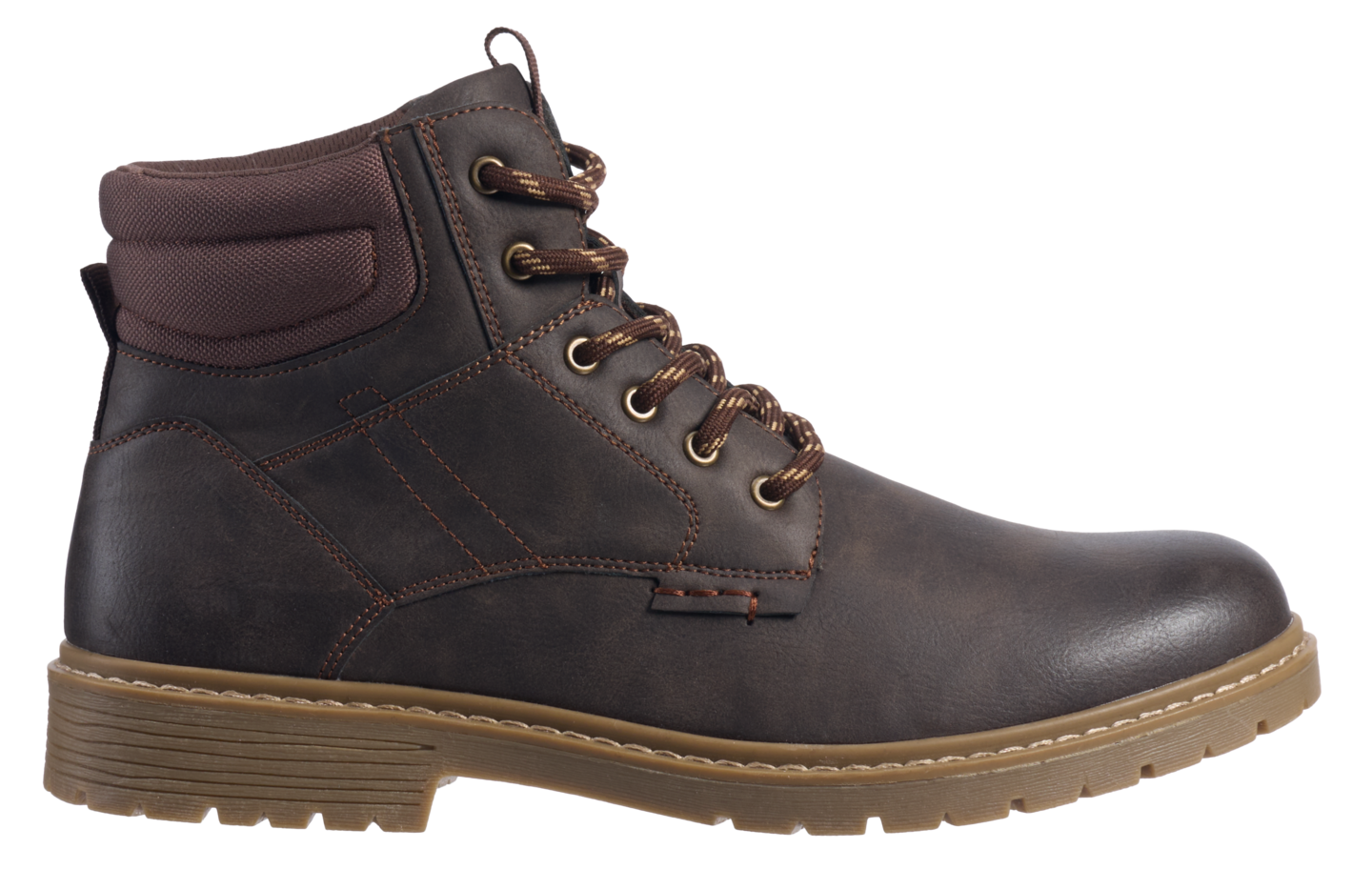 Tyylikkäät miesten ruskeat nilkkurit arkeen ja vapaa-aikaan. Päällinen helppohoitoista nahkajäljitelmää, kangasvuori. Termoplastinen kumipohja takaa hyvän pidon. Nauhakiinnitys.