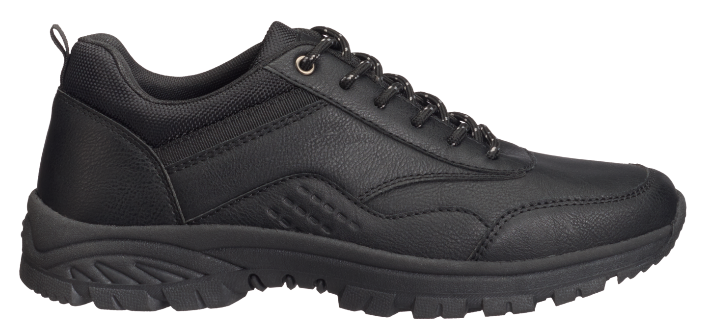 Miesten kävelykengät arkeen ja vapaa-aikaan. Päällinen nahkajäljitelmää. Kangasvuori lisää käyttömukavuutta ja hengittävyyttä. Ulkopohja termoplastista kumia.