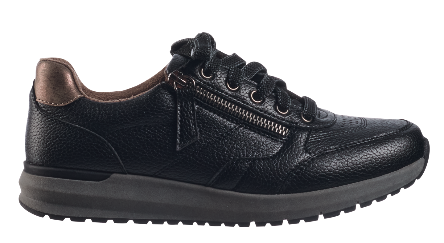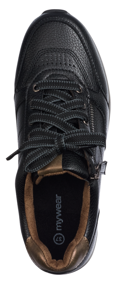 Mywear Monica naisten kävelykengät. Nauhalliset kengät ovat kuvioitua nahkajäljitelmää. Ulkopohjassa ja päällisessä on kontrastivärisiä yksityiskohtia. Kenkien päällä on myös toimiva vetoketju helpottamassa pukemista. Kenkien vuori on tekstiiliä ja ulkopohja on tpr-kumia.