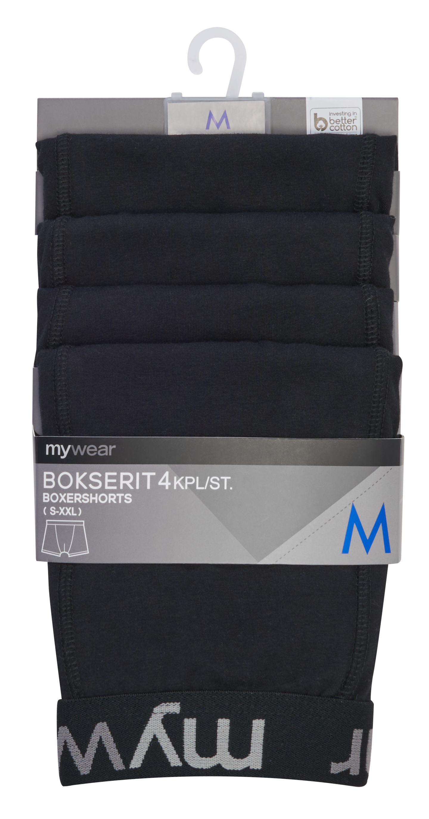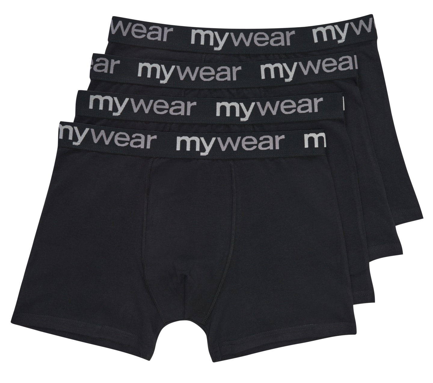 mywear bokserit 4kpl/pkt, värinä musta. Aukoton malli, joustavaa puuvilla-elastaania. Vyötäröllä mywear logo. Saatavana myös paketissa, jossa eri värejä