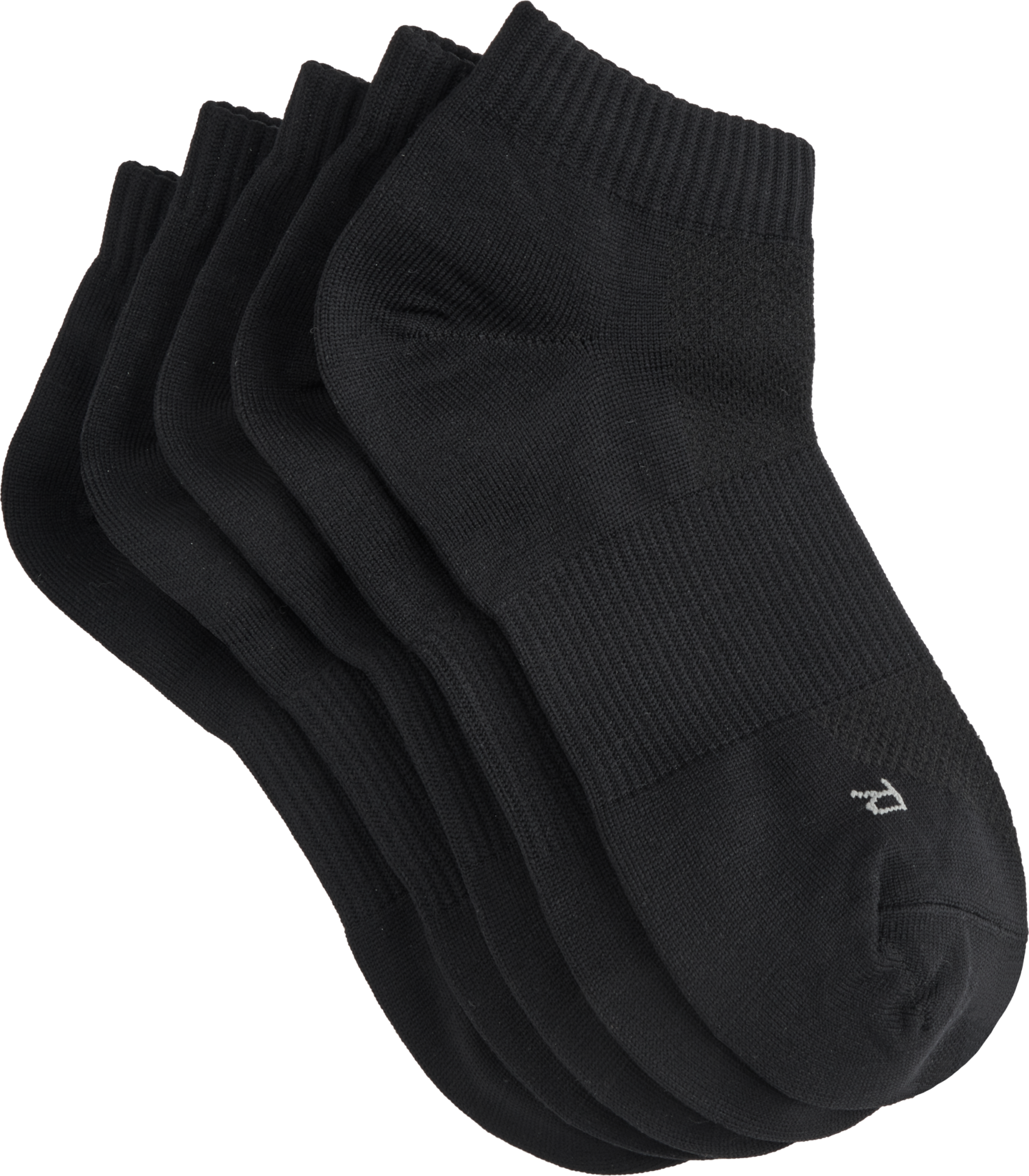 Pakkauksessa 5 paria mustia Quick Dry -sukkia. Hyvin istuvat matalavartiset sukat soveltuvat esimerkiksi urheiluun. Materiaali polyamidi sekoitetta.