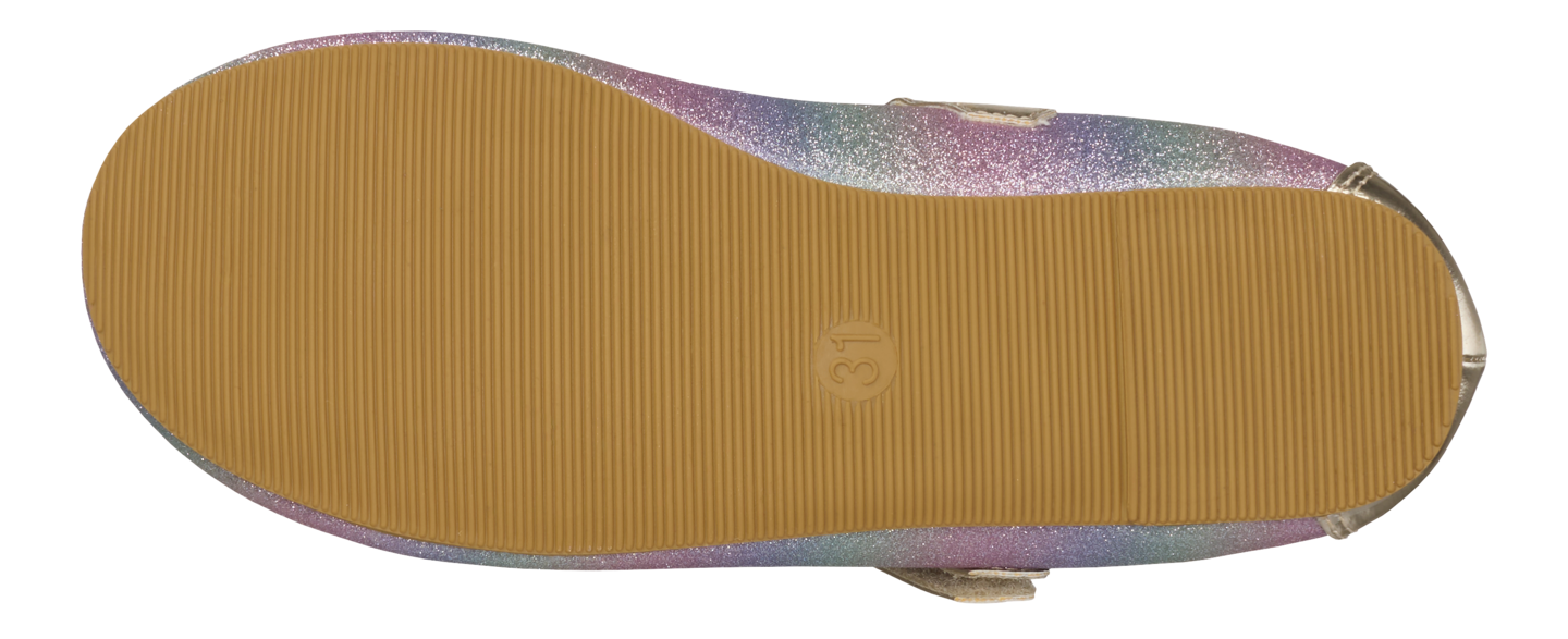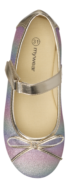 Lasten mywear Viola juhlavien ballerinojen glitteripäällinen kimaltelee upeasti vaaleanpunaisen, sinisen ja vihreän väreissä. Kenkiä somistaa siro kullanvärinen rusetti. Päällä oleva kullanvärinen tarraremmi pitää ballerinat hyvin jalassa. Vuori ja sisäpohja ovat miellyttävää tekstiiliä.