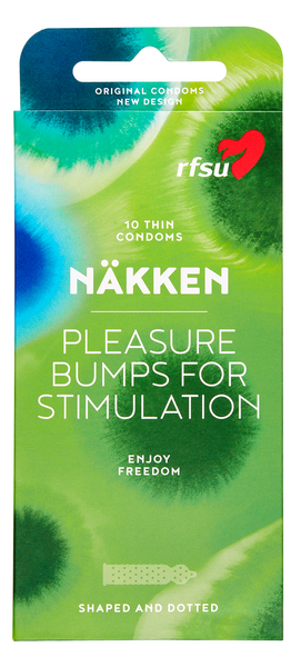 RFSU Näkken on ohut, juomutettu kondomi, jonka muotoillut nypyt lisäävät tuntoherkkyyttä. Täydellisesti istuva kondomi on väritön ja varmasti molempien mieleen. Liukuvoidekyllästetty.