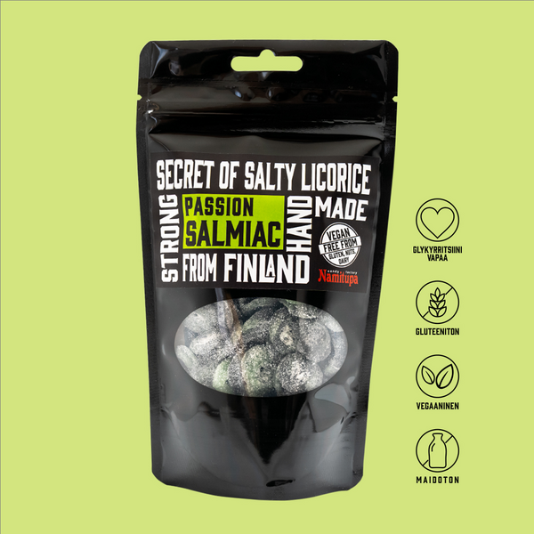 Namituvan passionsalmiakissa yhdistyvät herkullisen koukuttavaksi salmiakkielämykseksi raikkaan makea passion sekä ärhäkkä suolainen salmiakki. Passionsalmiakit ovat kaiken lisäksi glykyrritsiinivapaita, eli niillä voivat herkutella hyvällä omallatunnolla myös odottavat äidit sekä korkeasta verenpaineesta kärsivät salmiakin ystävät!