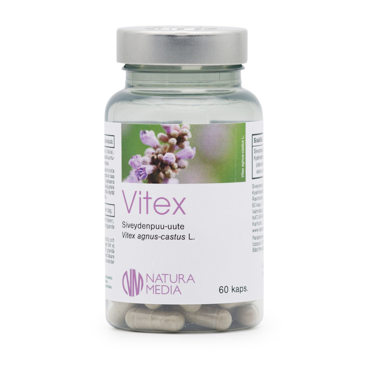 Natura Median Vitex-kapselit sisältävät ainoana vaikuttavana aineenaan siveydenpuu-uutetta. Siveydenpuun eli munkinpippurin marjat tunnetaan naisen hormonitoimintaa