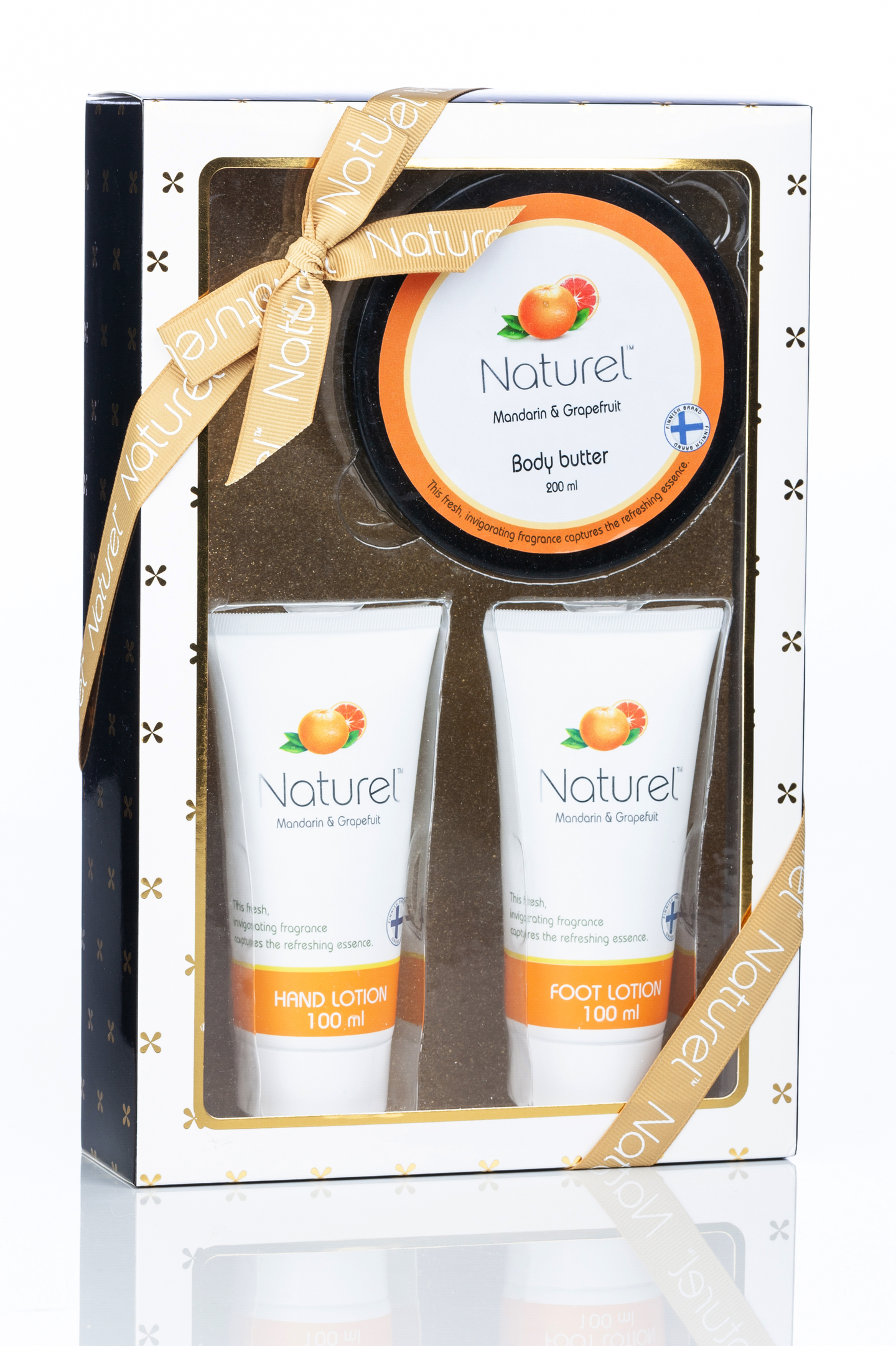Mandariinin tuoksuinen lahjapakkaus, sisältää 100ml jalkavoiteen ja 100ml käsivoiteen sekä 200ml vartalovoin