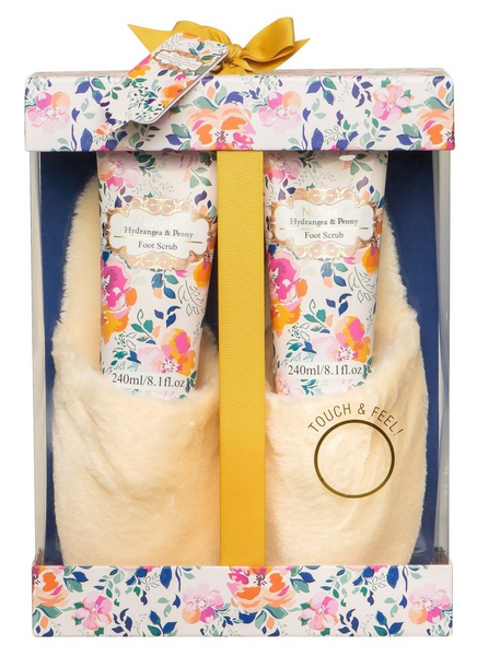 Pionin tuoksuinen lahjapakkaus, sisältää 240ml jalkavoiteen ja 240ml jalkakuorinnan sekä pehmoiset tossut