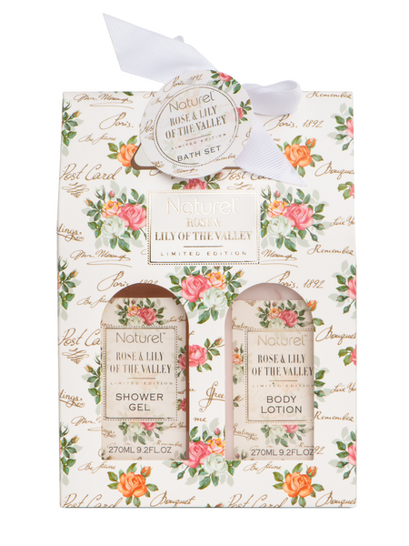 Ruusun tuoksuinen suihkulahjapakkaus, sisältää 270ml suihkugeelin ja 270ml vartalovoiteen