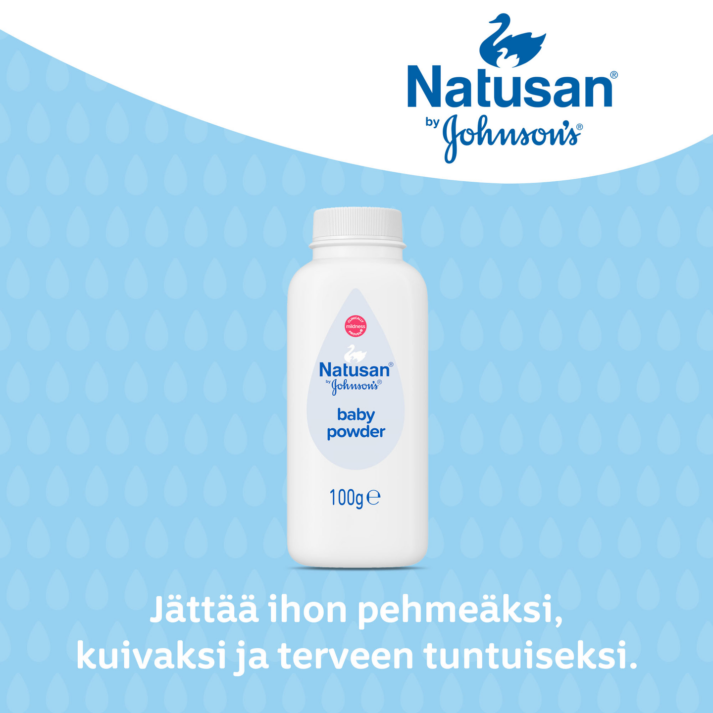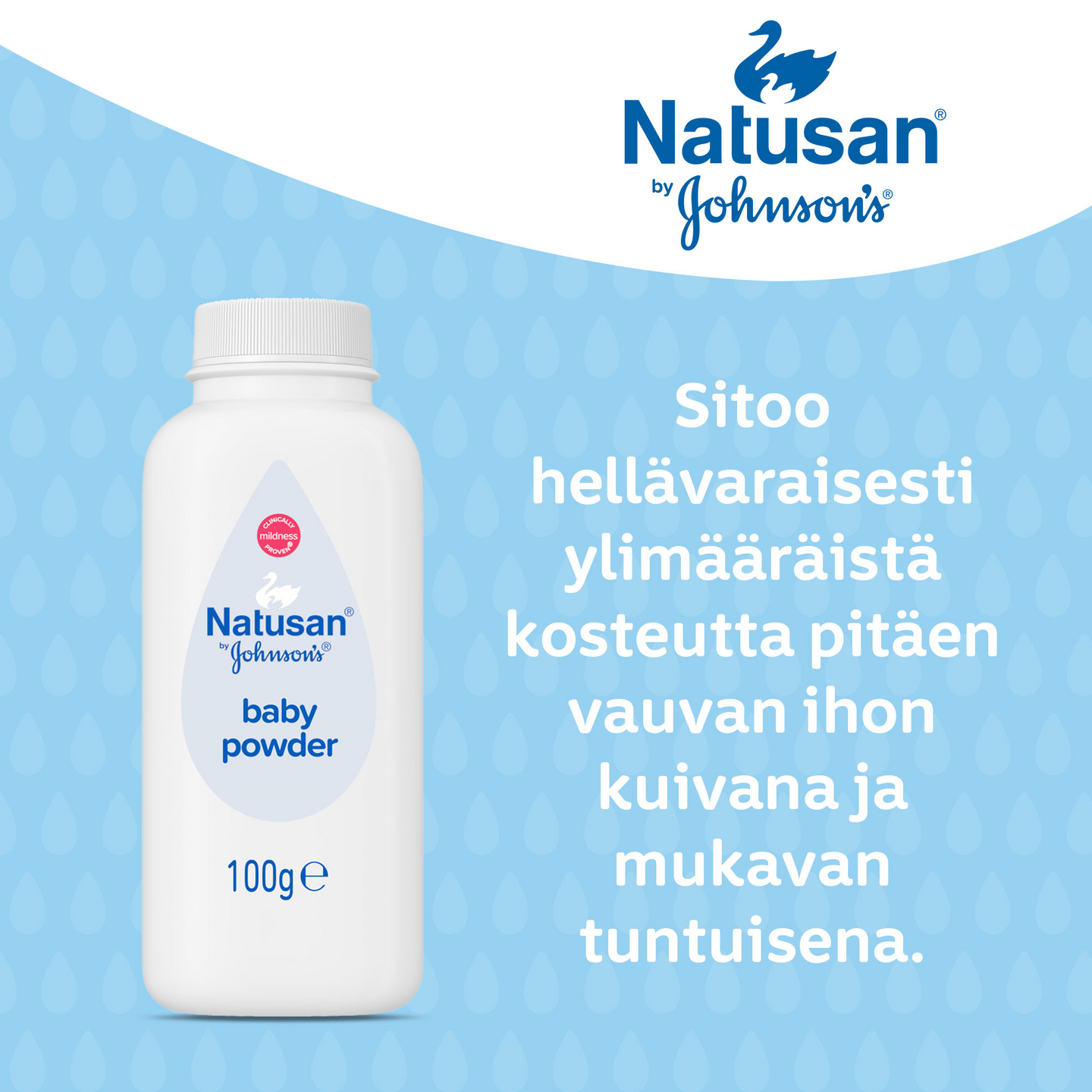 Natusan® by Johnson's® Baby Powder talkki imee vauvan iholta kosteutta, pitäen sen miellyttävän tuntuisena ja kuivana. Auttaa suojaamaan ihoa hankaukselta ja hiertymiltä.