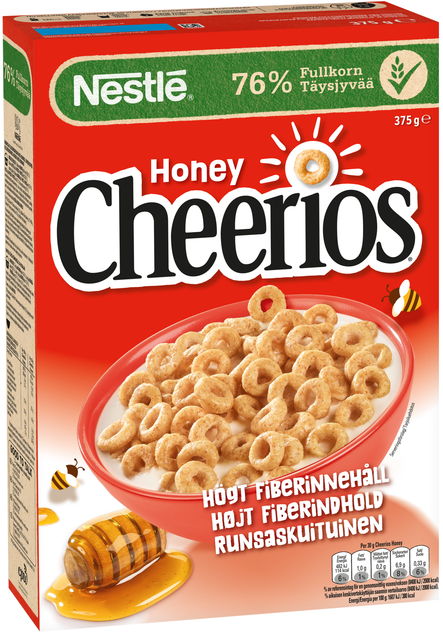 "NESTLÉ CHEERIOS Hunajamurot 375 g Hunaja-CHEERIOS – makea ja rapea startti päivään Hunaja-CHEERIOS yhdistää herkullisen hunajan maun ja rapean koostumuksen. Jokainen kulhollinen sisältää kuitua kolmesta täysjyväviljasta – kaurasta, vehnästä ja ohrasta – ja tarjoaa luonnollisen aloituksen päivälle ilman keinotekoisia väri- tai makuaineita. Täydellinen koko perheen suosikki.