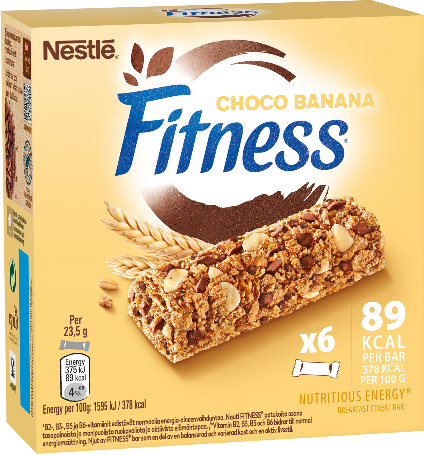 Choco & Banana – suklaan ja banaanin täydellinen yhdistelmä kiireisiin aamuihin Missä tahansa aamusi sinut vievät, ota mukaan NESTLÉ FITNESS Choco & Banana -patukka ja nauti täysjyväviljan, banaanin ja suklaan herkullisesta yhdistelmästä. Sisältää rapeita kaurahiutaleita, makean banaanin vivahteen ja pehmeitä maitosuklaapaloja, jotka tekevät jokaisesta puraisusta vastustamattoman.
