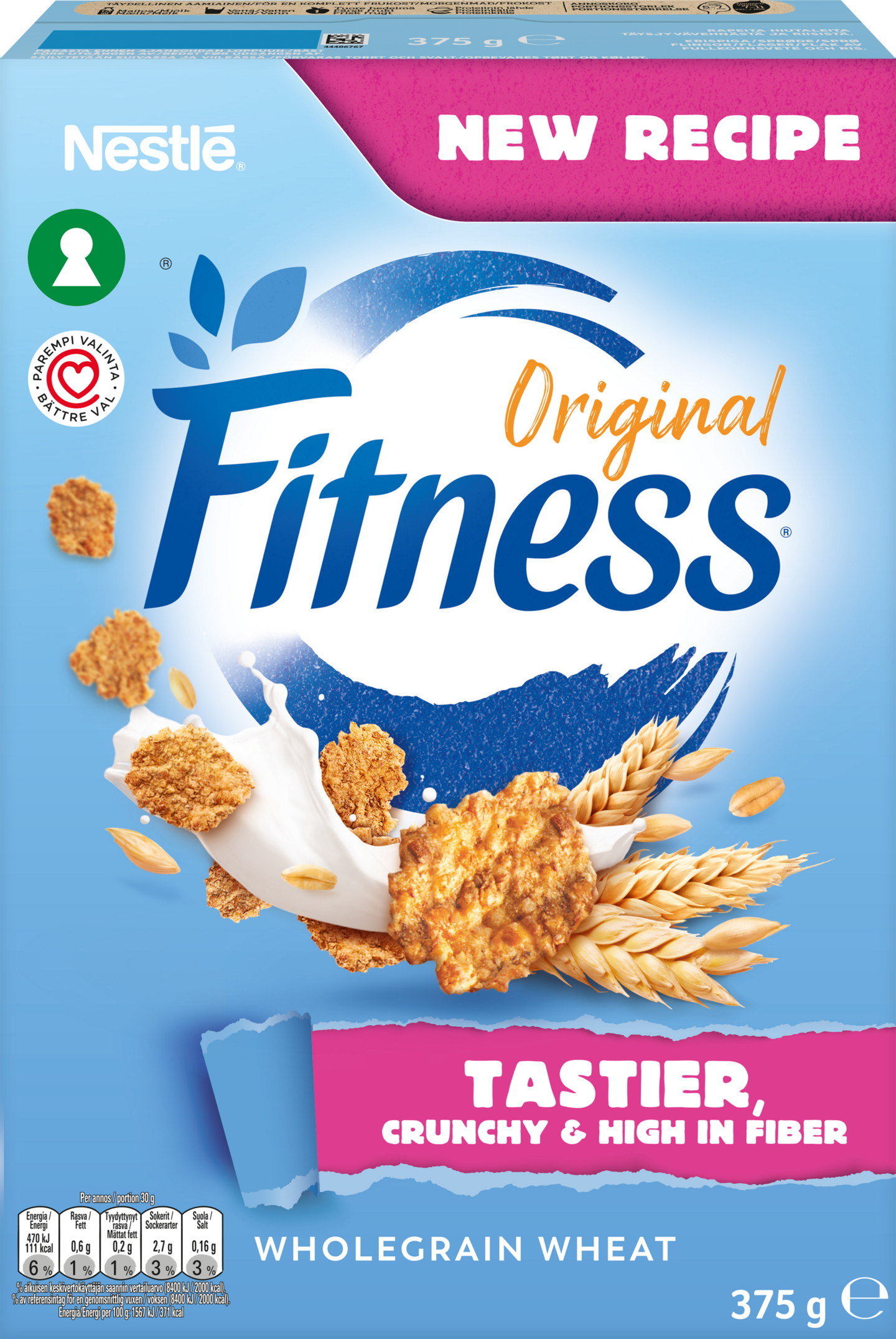 NESTLÉ FITNESS Original 375 g Fitness Original – rapea ja täysjyväinen aloitus päivään Rapeat täysjyvävehnähiutaleet (61 % täysjyvä) tarjoavat kuitua ja herkullista makua. Sopii maidon, kasvipohjaisen vaihtoehdon tai jogurtin kanssa – täydellinen tasapaino makua ja hyvyyttä.