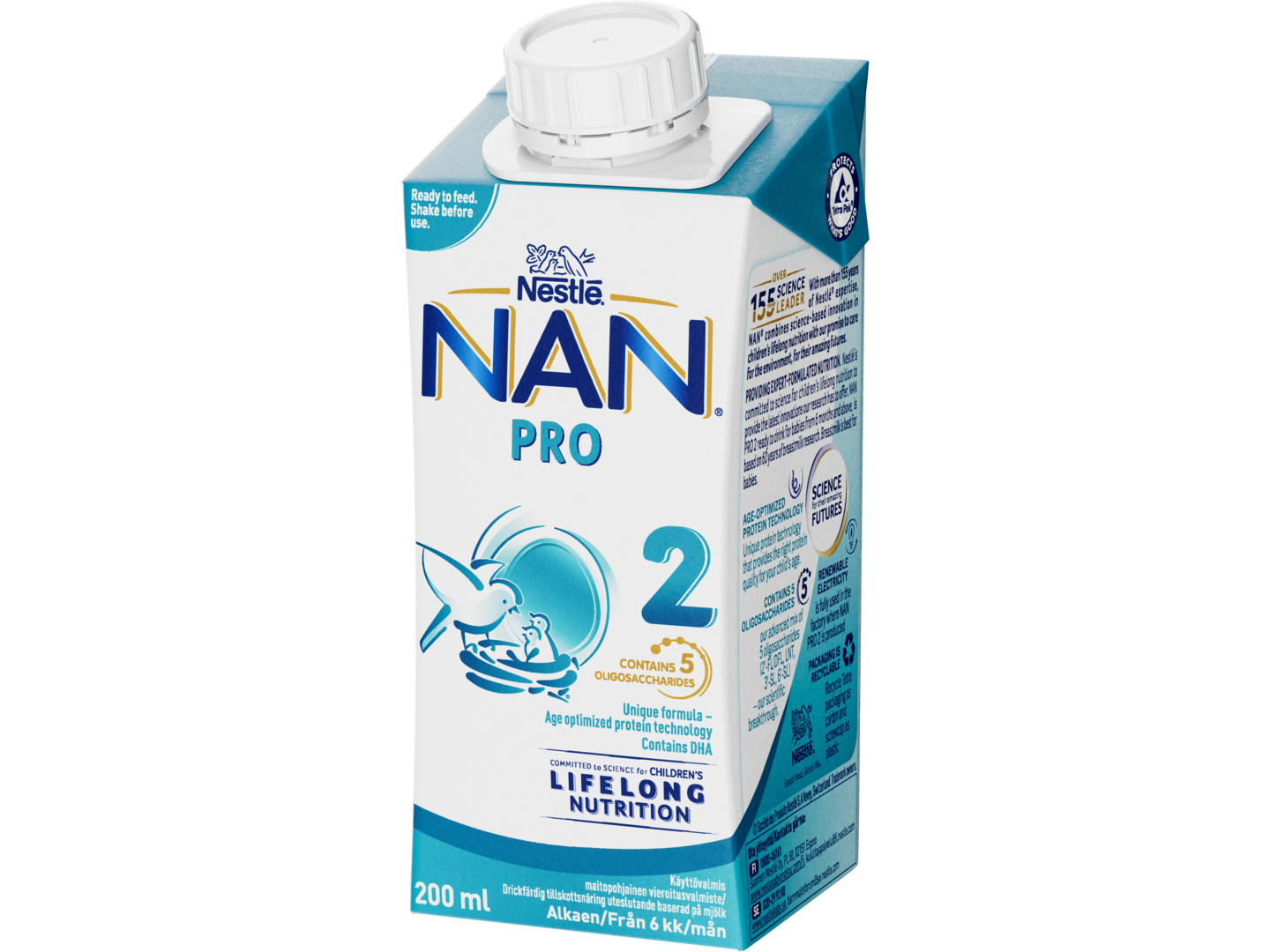 "Nestlé NAN PRO 2 200ml on käyttövalmis maitopohjainen vieroitusvalmiste, jota voidaan antaa 6 kuukauden iästä alkaen osana tasapainoista ja monipuolista ruokavaliota. NAN PRO 2 sisältää kehittyneen viiden oligosakkaridin yhdistelmäämme ja proteiiniteknologian, jonka ansiosta tuotteen proteiinikoostumus vastaa vauvan iänmukaista tarvetta. Olemme sitoutuneet tukemaan lasten elinikäistä ravitsemusta hyödyntämällä tieteeseen perustuvaa tutkimusta sekä osaamistamme tuotteissamme. Ainutlaatuinen NAN PRO 2 vieroitusvalmiste yli 6 kuukauden ikäisille vauvoille on kehitetty yli 60 vuoden rintamaidon tutkimuksen innoittamana. Äidinmaito on imeväisen parasta ravintoa. Mikä NAN PRO 2 -vieroitusvalmisteessa on erityistä: • KEHITTYNYT PROTEIINITEKNOLOGIA, joka tarjoaa lapsellesi ainutlaatuisen proteiinin laadun ja -määrän. • 5 OLIGOSAKKARIDIA NAN PRO 2 sisältää kehittynyttä viiden oligosakkaridin (2'-FL/DFL, LNT, 3'-SL, 6'-SL) yhdistelmäämme. Oligosakkaridit ovat rakenteeltaan identtisiä äidinmaidossa luonnollisesti eniten esiintyvien oligosakkaridien kanssa. • SISÄLTÄÄ DHA:ta, joka tukee alle 12 kuukauden ikäisten imeväisten näön normaalia kehitystä. Edullinen vaikutus saavutetaan nauttimalla päivittäin 100mg DHA:ta.* • SISÄLTÄÄ D-VITAMIINIA & JODIA Tuote sisältää D‐vitamiinia, joka edistää immuunijärjestelmän normaalia toimintaa lapsilla sekä jodia, joka edistää lasten normaalia kasvua.* *Osana tasapainoista ja monipuolista ruokavaliota sekä terveitä elämäntapoja. Tuote on halal-sertifioitu. NAN PRO 2 on saatavilla jauhemaisena ja nestemäisenä. TÄRKEÄÄ! Äidinmaito on imeväisen parasta ravintoa, ja imetystä tulee jatkaa niin pitkään kuin mahdollista. NAN PRO 2 voidaan käyttää osana monipuolista ruokavaliota 6 kuukauden iästä alkaen. NAN PRO 2 ei ole tarkoitettu äidinmaidonkorvikkeeksi alle 6 kk:n ikäisille lapsille. 6 kk:n iästä alkaen suositellaan muun ruoan tarjoamista makuannoksina. Ole yhteydessä neuvolaan ennen vieroitusvalmisteen käyttöä. Huomioithan, että tuoteseloste saattaa muuttua – lue aina pakkauksen ainesosaluettelo ennen ennen tarjoamista.