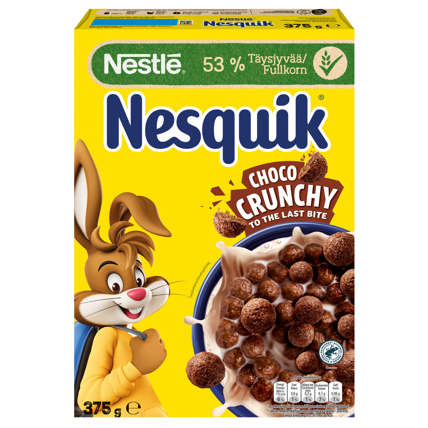 NESTLÉ NESQUIK Suklaamurot 375 g Nauti ikoninen suklaanmaku ja rapeus – NESQUIK tekee aamiaisesta hauskan ja herkullisen Aloita päiväsi NESTLÉ NESQUIK -muroilla ja koe klassinen suklaanmaku, joka tuo iloa koko perheelle. Jokainen rapea muro pysyy rapeana maidossa ja muuttaa sen vastustamattoman suklaiseksi. NESQUIK-murot on valmistettu täysjyvävehnästä, joka on tärkein ainesosa, ja ne tarjoavat kuitua sekä seitsemän vitamiinia ja rautaa, jotta saat ravitsevan ja energisen aloituksen päivälle. Ei keinotekoisia väri- tai makuaineita .Tarjoa maidon tai kasvipohjaisen vaihtoehdon kanssa ja lisää tuoreita hedelmiä täydelliseen aamiaiseen.