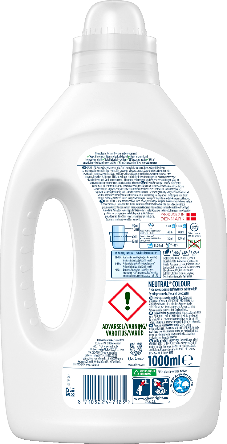 Neutral Colour nestemäinen pyykinpesuaine hajusteeton 1000 ml on kirjopesuaine, joka on kehitetty erityisesti herkälle iholle. Nestemäinen pesuaine on allergiaystävällinen, ei sisällä väriaineita tai hajusteita, mikä vähentää allergisia ihoreaktioita ja ihoärsytystä. Neutral Colour pyykinpesuneste poistaa tehokkaasti likaa ja tahraa. Neutral on kehitetty yhteistyössä kolmen pohjoismaisen Astma- ja allergiayhdistyksen (Asthma Allergy Nordic) kanssa. Sillä on Joutsenmerkki, joka on Pohjoismaissa käytettävä virallinen ympäristömerkki . Neutral Colour nestemäinen pyykinpesuaine hajusteeton tarjoaa seuraavia etuja: • Poistaa tehokkaasti lian ja tahrat • Pesee puhtaaksi jo alhaisissa lämpötiloissa • Sopii konepesuun ja käsipyykille • Suunniteltu vähentämään allergisia ihoreaktioita • Hajusteeton ja väriaineeton • Dermatologisesti testattu • Ympäristömerkki eli Joutsenmerkitty • Auttaa vaatteita säilyttämään värinsä pidempään – niin värillisiä kuin tummia • Kun peset valkopyykkiä, lakanoita, vaatteita, pyyhkeitä ym. valitse Neutral White nestemäinen valkopesuaine • Neutral-sarjasta löytyy paitsi pesuaineita ja huuhteluaineita, myös tuotteita henkilökohtaisen hygienian hoitoon, kuten suihkusaippua, shampoo ja ihovoide. Sarjassa on tuotteita myös lapsille ja vauvoille, kuten kosteusliina ja ihonhoitoöljy. Kaikki tuotteet ovat hajusteettomia ja väriaineettomia. Jokainen iho on erilainen, mikä tarkoittaa, että sama tuote ei sovi jokaiselle perheenjäsenelle. Tässä tulee Neutral avuksi. Tavoitteenamme on huolehtia koko perheen ihosta. Siksi tarjoamme monipuolisen valikoiman hellävaraisia tuotteita, jotka suojaavat ihoärsytykseltä. Alkaen normaalista ihosta herkkään ihoon, vauvan ihosta helposti ärsyyntyvään ja reagoivaan ihoon. Jokainen Neutral-tuote pesuaineesta käsirasvaan – ja kaikkeen siltä väliltä – auttaa sinua huolehtimaan ihostasi hellävaraisemmin joka päivä. Neutral Colour on kehitetty erityisesti herkälle iholle, ja sitä suosittelee Asthma Allergy Nordic ja Allergy Certified.
