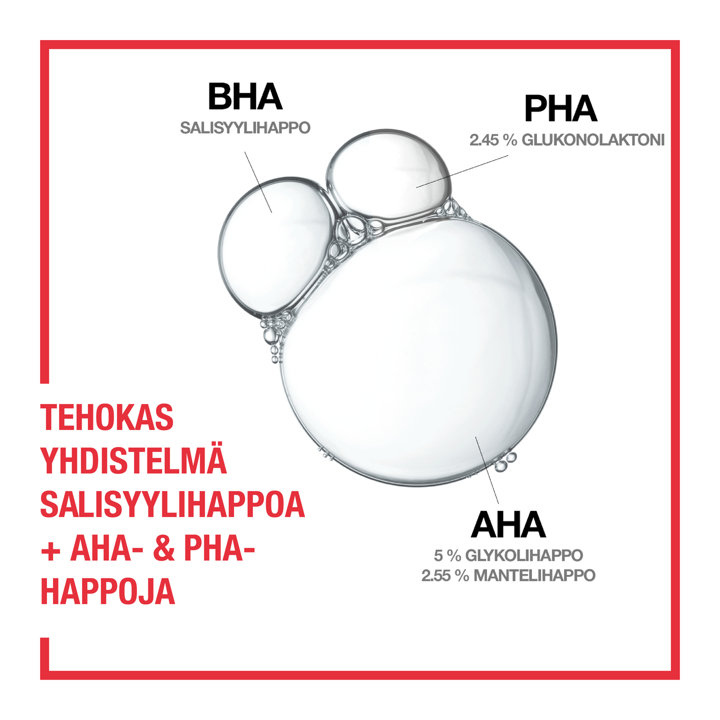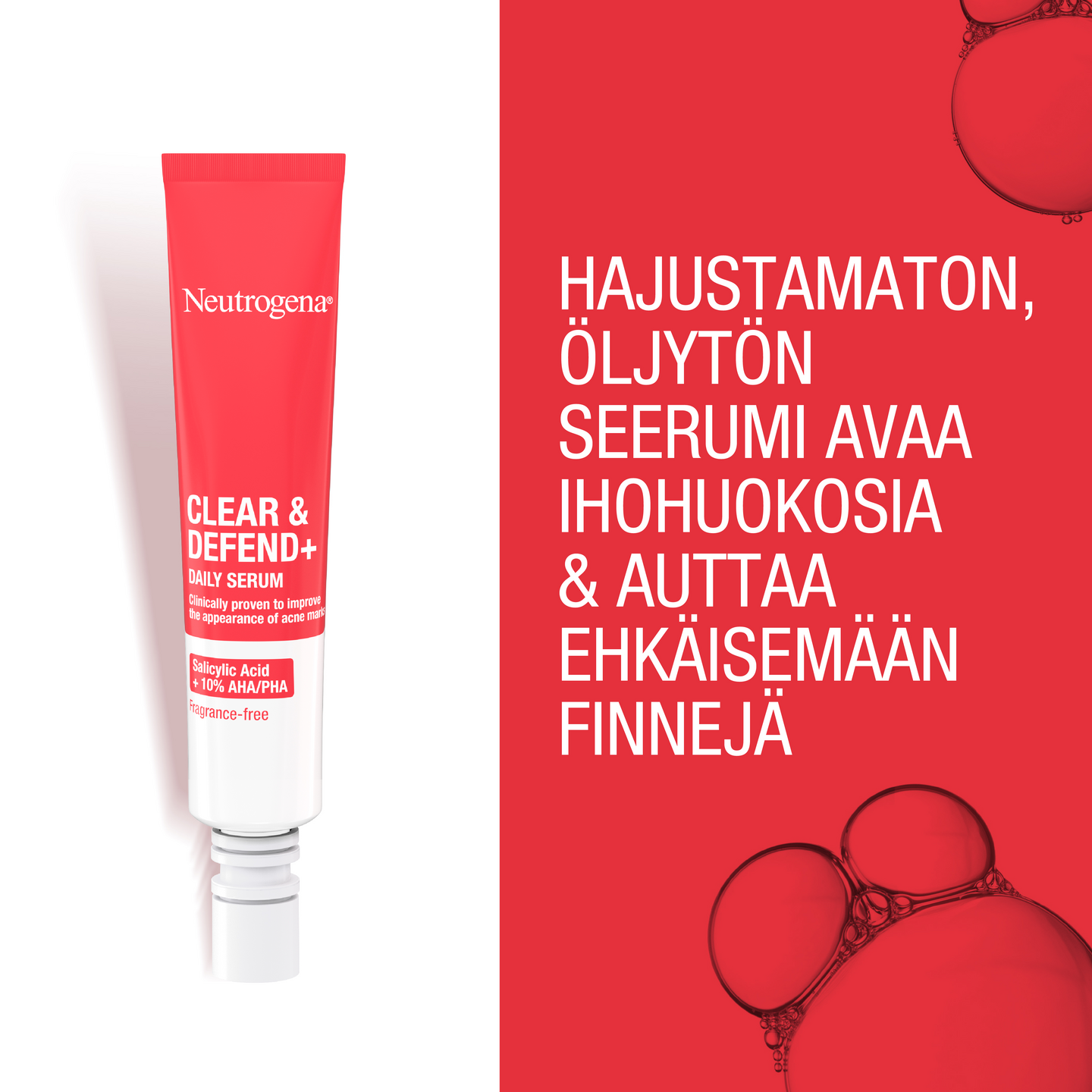 Hajustamaton Neutrogena® Clear & Defend+ Daily Serum -kasvoseerumi auttaa ehkäisemään epäpuhtauksia, silottaa ihoa ja lisää ihon hehkua. Seerumi sisältää salisyylihappoa sekä tehokkaan 10 % yhdistelmän AHA- ja PHA-happoja: - Glykolihappo (5%) edistää ihon pintasolujen uusiutumista (in vitro) ja auttaa häivyttämään aknen jättämiä jälkiä. - Mantelihappo (2,55 %), kuoriva ainesosa edistää ihon uusiutumista auttaen lisäämään ihon hehkua. - Glukonolaktoni (2,45 %) auttaa puhdistamaan ihohuokoset ja tasoittamaan ihoa. Öljytön, ihohuokosia tukkimaton koostumus. Terveemmän näköinen iho jo 1 viikossa! (Itsearviointi, 67 käyttäjää).