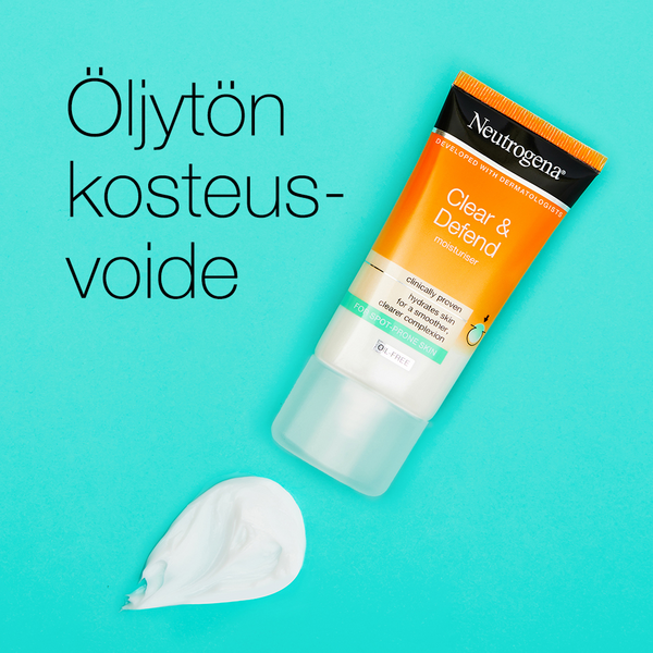 Ihoa puhdistavaa salisyylihappoa sisältävä Neutrogena Clear & Defend Moisturiser -kosteusvoide herkästi epäpuhtauksiin reakoivan ihon hoitoon.