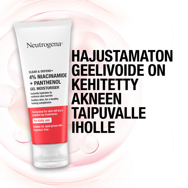 Hajustamaton Neutrogena® Clear & Defend+ Gel Moisturiser -kosteusvoide kosteuttaa ihoa välittömästi, rauhoittaa ihoa sekä vahvistaa ihon suojamuuria. Se sopii finneille alttiille iholle päivittäiseen käyttöön eikä tuki ihohuokosia. Epäpuhtaalle iholle suunnatut tehohoidot voivat jättää ihon kuivan tuntuiseksi ja herkäksi. Tämä kosteusvoide suojaa ihoa kuivumista vastaan. Sen pH on optimoitu, jotta voide on tehokas mutta hellävarainen iholle. Geelivoide sisältää 4 % niasiiniamidia, joka tunnetaan ihoa tasoittavista ja silottavista ominaisuuksistaan, sekä 1 % pantenolia, joka auttaa rauhoittamaan ihoa ja säilyttämään sen kosteuden.
