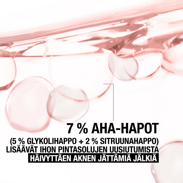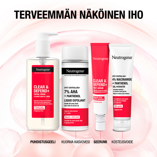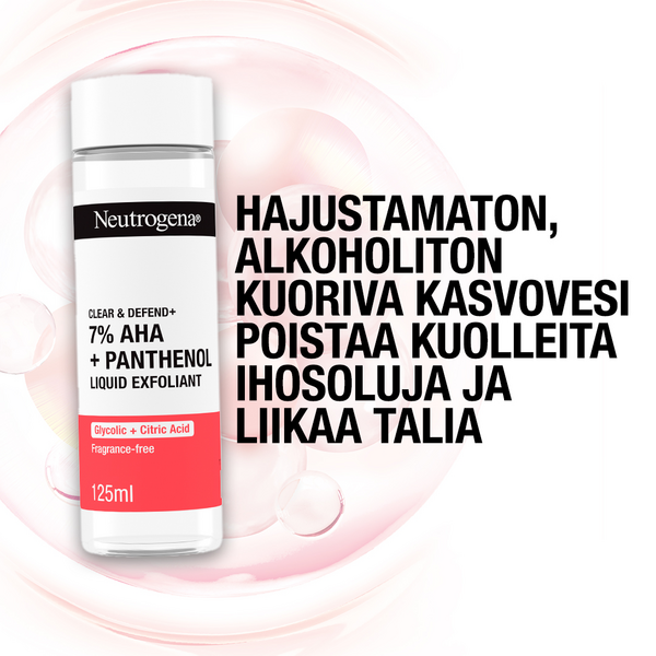 Hajustamaton Neutrogena® Clear & Defend+ Liquid Exfoliant -kasvovesi auttaa poistamaan kuolleita ihosoluja ja liikaa talia, jotka voivat aiheuttaa epäpuhtauksia. Se sopii finneille alttiille iholle, kaikille ihotyypeille. Kuoriva kasvovesi sisältää 7 % yhdistelmän AHA-happoja (5 % glykolihappo + 2 % sitruunahappo), joka nopeuttaa ihon pintasolujen uusiutumista auttaen häivyttämään aknen jättämiä jälkiä ja tasoittamaan ihoa. Pantenoli (0,5 %) auttaa rauhoittamaan ihoa ja säilyttämään sen kosteuden. Tasoittaa ihoa yhdessä viikossa.