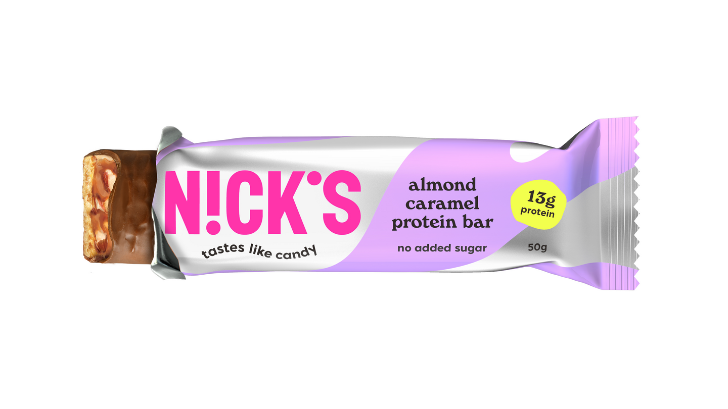 Almond Caramel proteiinipatukka on täydellinen yhdistelmä makeaa karamellia, rapeita mantelipaloja ja herkullista suklaakuorrutetta. Patukassa on 13g proteiinia. se on gluteeniton, eikä siinä ole lisättyä sokeria tai palmuöljyä.