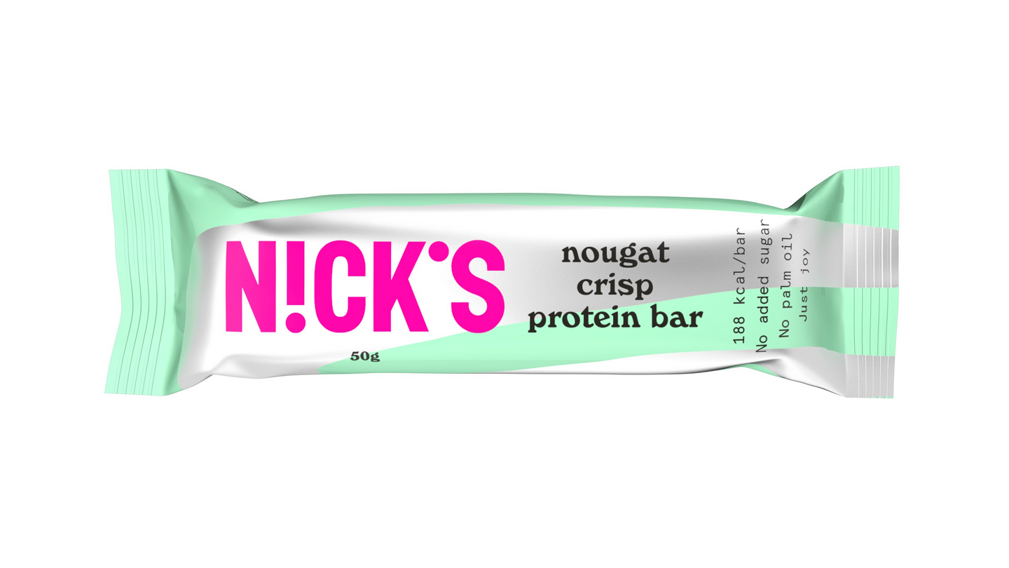 Rapea nougat'tan ja suklaan makuinen proteiinipatukka. Yksi patukka sisältää 15g proteiinia ja vain 188 kcal. Nick's tuotteet eivät sisällä lisättyä sokeria, vehnää tai palmuöljyä - mausta kuitenkaan tinkimättä.